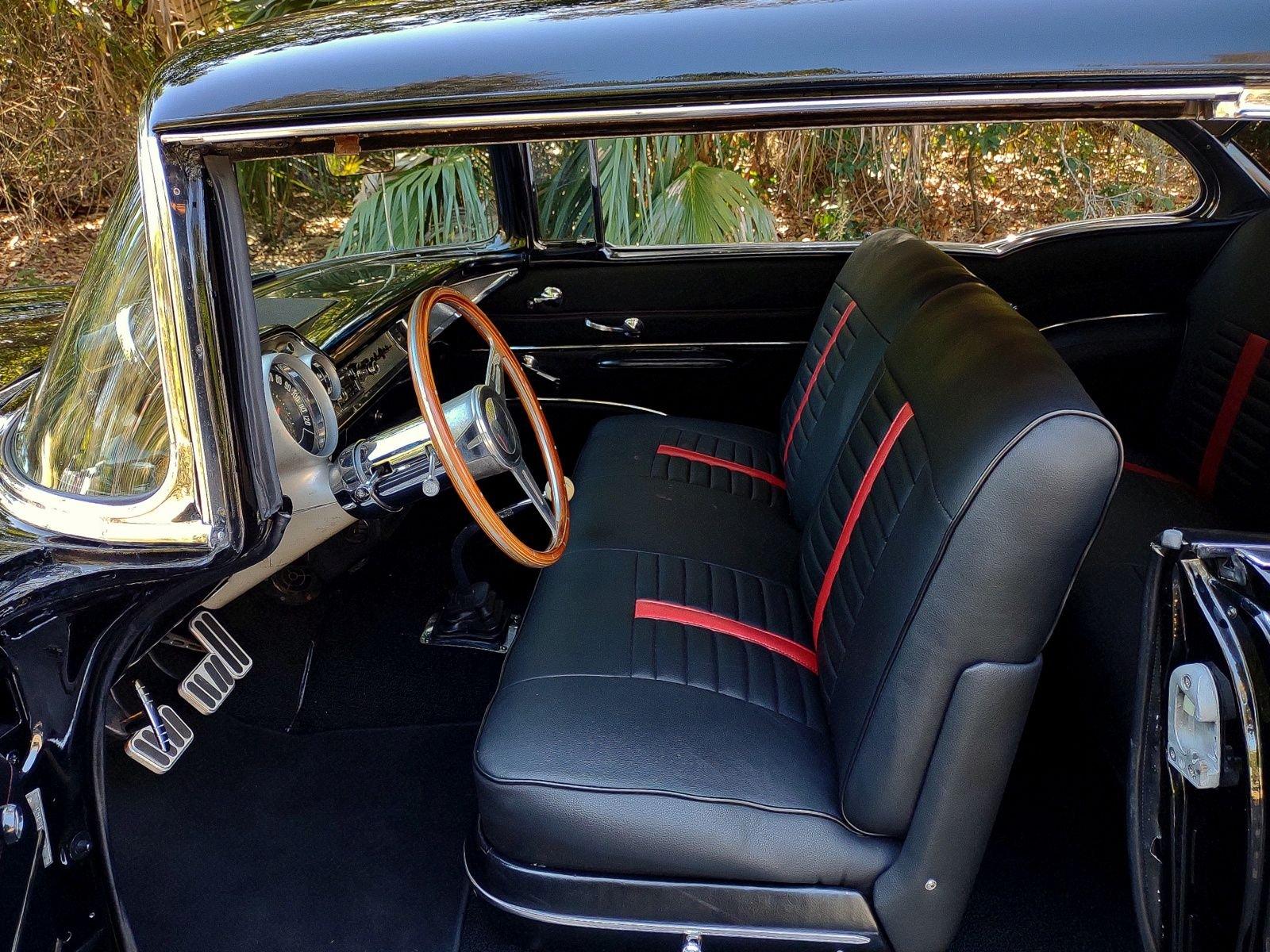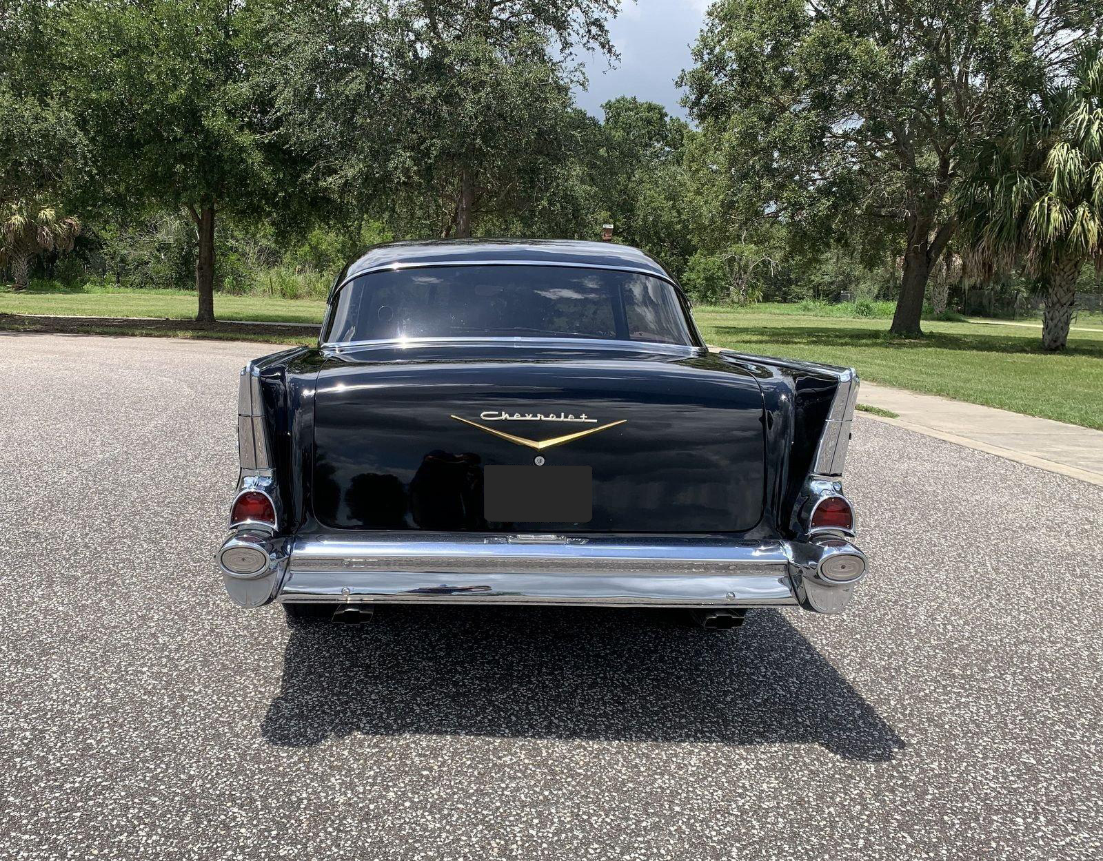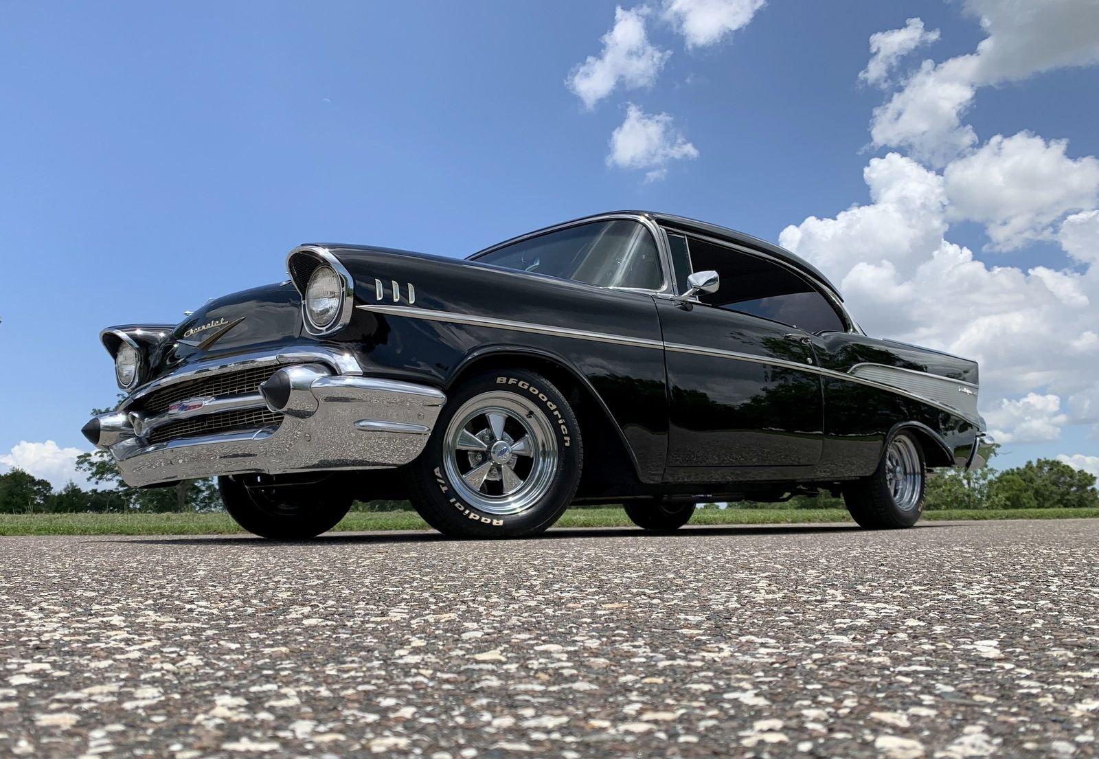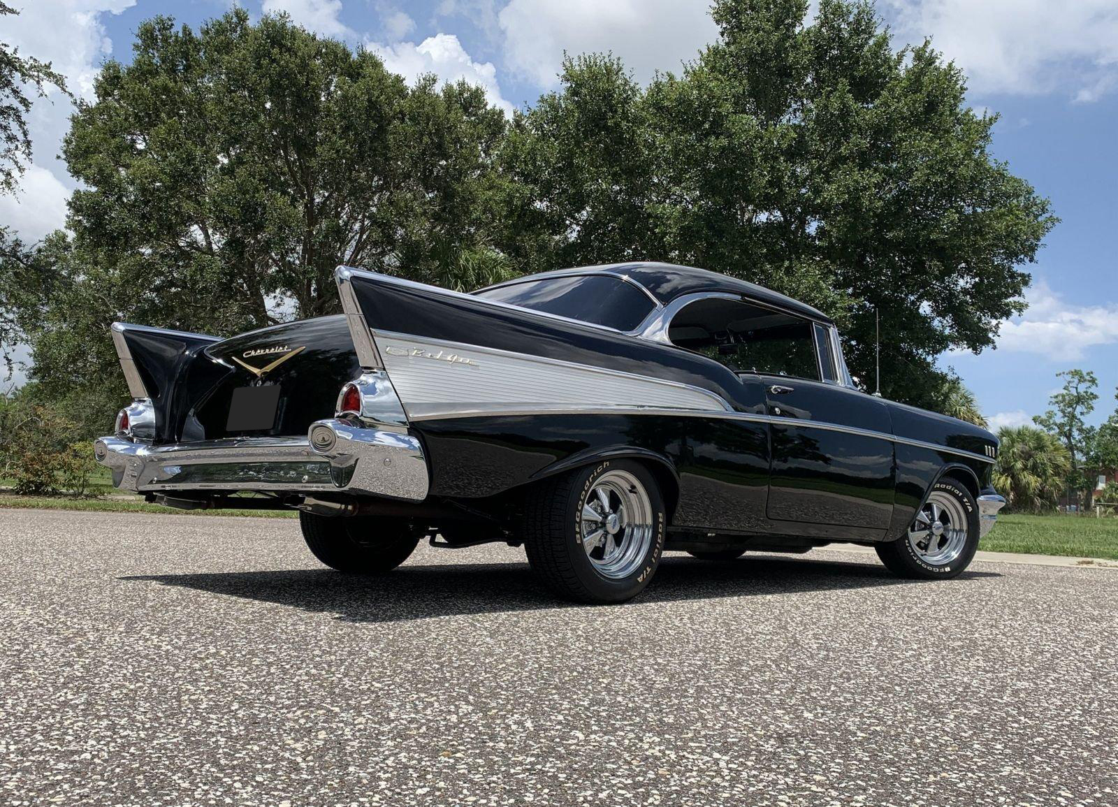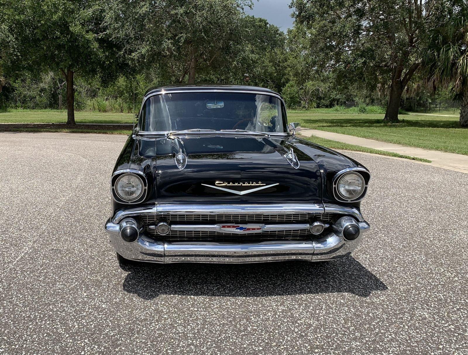 We are pleased to offer this 1957 Chevrolet Bel Air Restomod Hardtop for Sale. This Black Beauty is ready to enjoy! Powered by a 327 Cu In V8 with an Edelbrock aluminum intake and Edelbrock 4 barrel carb, MSD Ignition, engine dress up kit, aluminum radiator and completed by headers into throaty dual exhaust all in a detailed engine bay. It's mated to a 4 speed manual transmission with Hurst Shifter and equipped with power steering, power disc brakes and air conditioning. The interior has a beautiful black custom bench seat, Ididit tilt steering column, Lecarra wood grain steering wheel, AM/FM cassette radio and Bosch Tach. The car's straight body is accented by great margins, clear glass, brilliant moldings and hi-gloss chrome. The rear suspension can be adjusted with air shocks to give the car the stance desired, raised for an aggressive appearance or lowered for cruising. The car rolls on a set of Cragar Wheels carrying BF Goodrich raised white letter radials 225/60R 14's on the front with a little wider 245/60R 14's on the rear to assist with the car's handling.