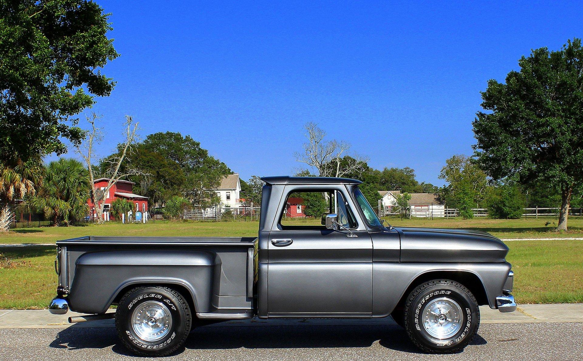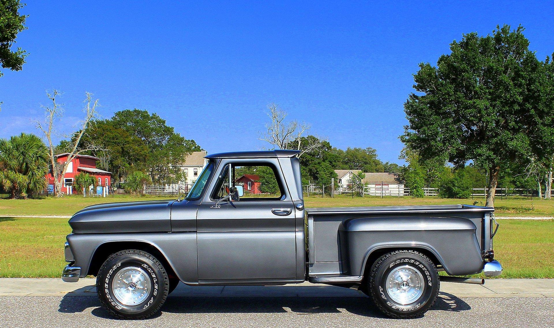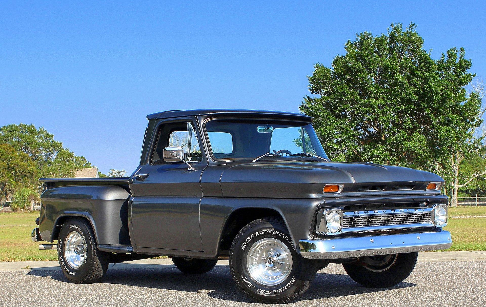 We are pleased to offer this 1966 Chevy C10 Stepside Pickup for Sale. Restored and ready to roll! Finished in a silver gray metallic. Accented by amazing chrome, bumpers, grille, mirrors and even the sill plates on the interior have been replaced to give this popular Pickup an outstanding appearance! Powered by a 350 Cu In V8 mated to an automatic transmission. Equipped with power steering and power disc brakes. The straight body has great margins and is completed by a restored wood floor bed and new chrome strips. The engine bay has been detailed and subtle items have been added such as aluminum valve covers, chrome air breather and the most noticeable upgrade an aluminum radiator with electric fan. The interior has retained a more traditional appearance with a black bench seat, replaced rubber floor mat, standard radio and the addition of a wood grain steering wheel. The dash and gauge cluster have also been restored. This C10 rolls on a set of polished solid aluminum American Racing Wheels carrying Bridgestone raised white letter all terrain tires in 31X10/50R 15LT.