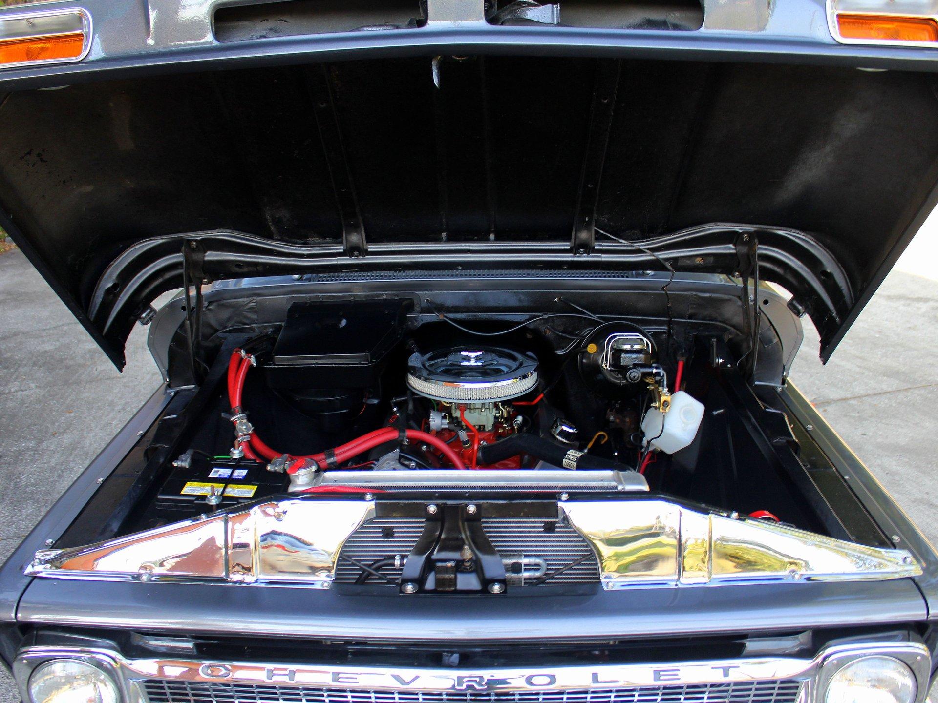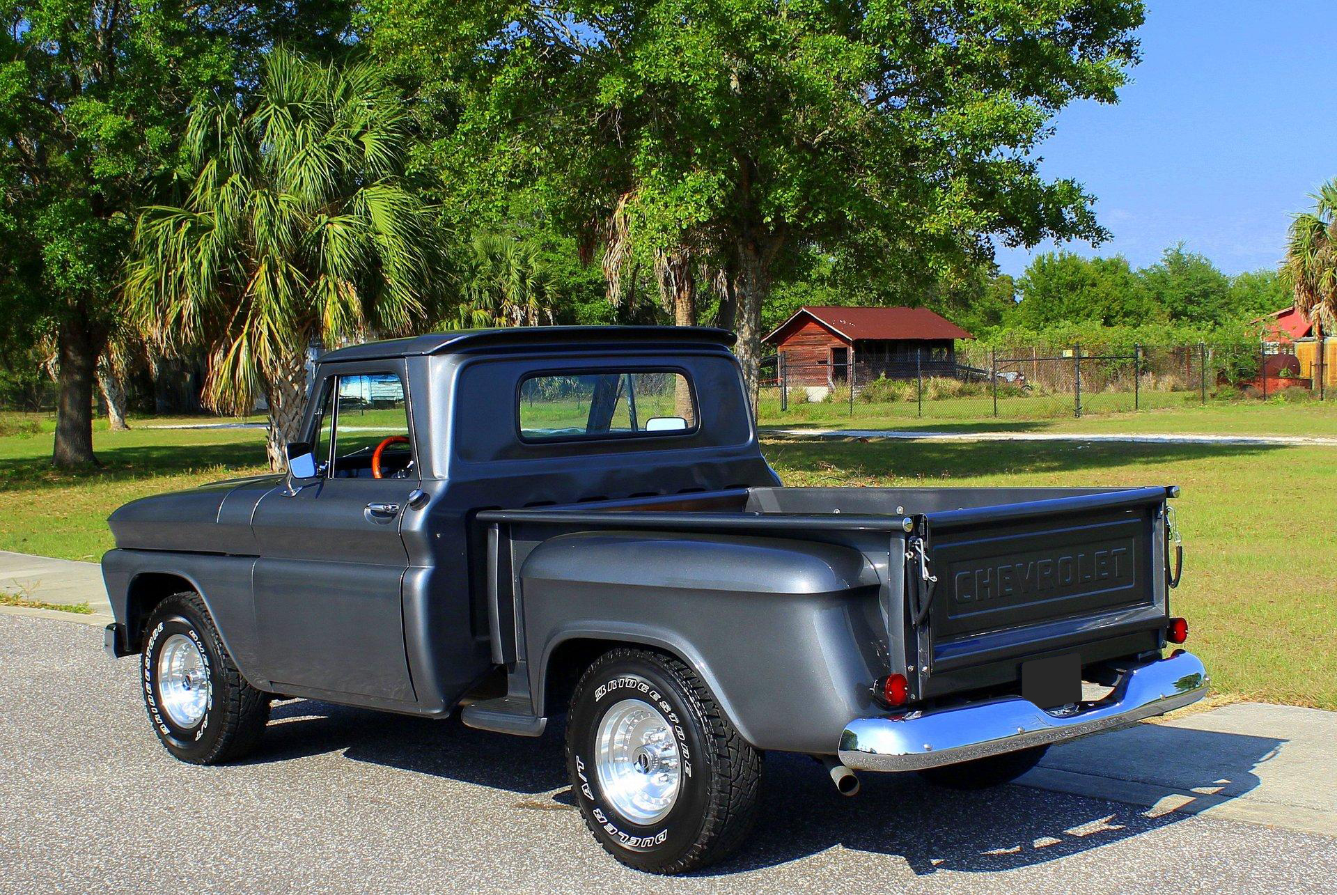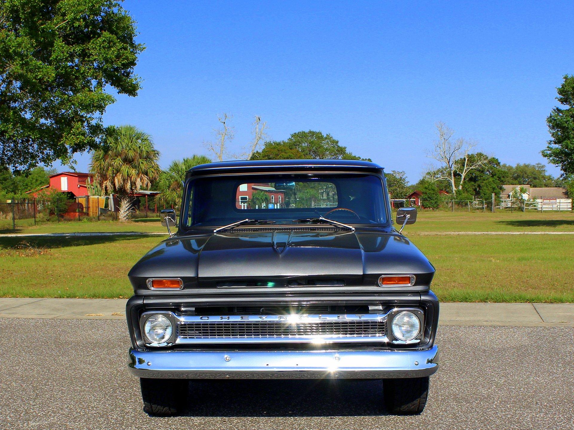 We are pleased to offer this 1966 Chevy C10 Stepside Pickup for Sale. Restored and ready to roll! Finished in a silver gray metallic. Accented by amazing chrome, bumpers, grille, mirrors and even the sill plates on the interior have been replaced to give this popular Pickup an outstanding appearance! Powered by a 350 Cu In V8 mated to an automatic transmission. Equipped with power steering and power disc brakes. The straight body has great margins and is completed by a restored wood floor bed and new chrome strips. The engine bay has been detailed and subtle items have been added such as aluminum valve covers, chrome air breather and the most noticeable upgrade an aluminum radiator with electric fan. The interior has retained a more traditional appearance with a black bench seat, replaced rubber floor mat, standard radio and the addition of a wood grain steering wheel. The dash and gauge cluster have also been restored. This C10 rolls on a set of polished solid aluminum American Racing Wheels carrying Bridgestone raised white letter all terrain tires in 31X10/50R 15LT.