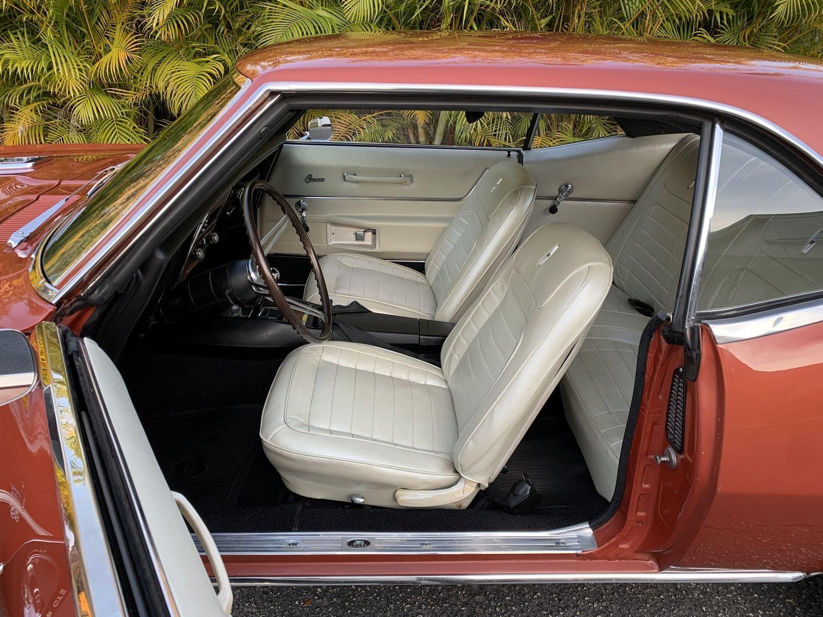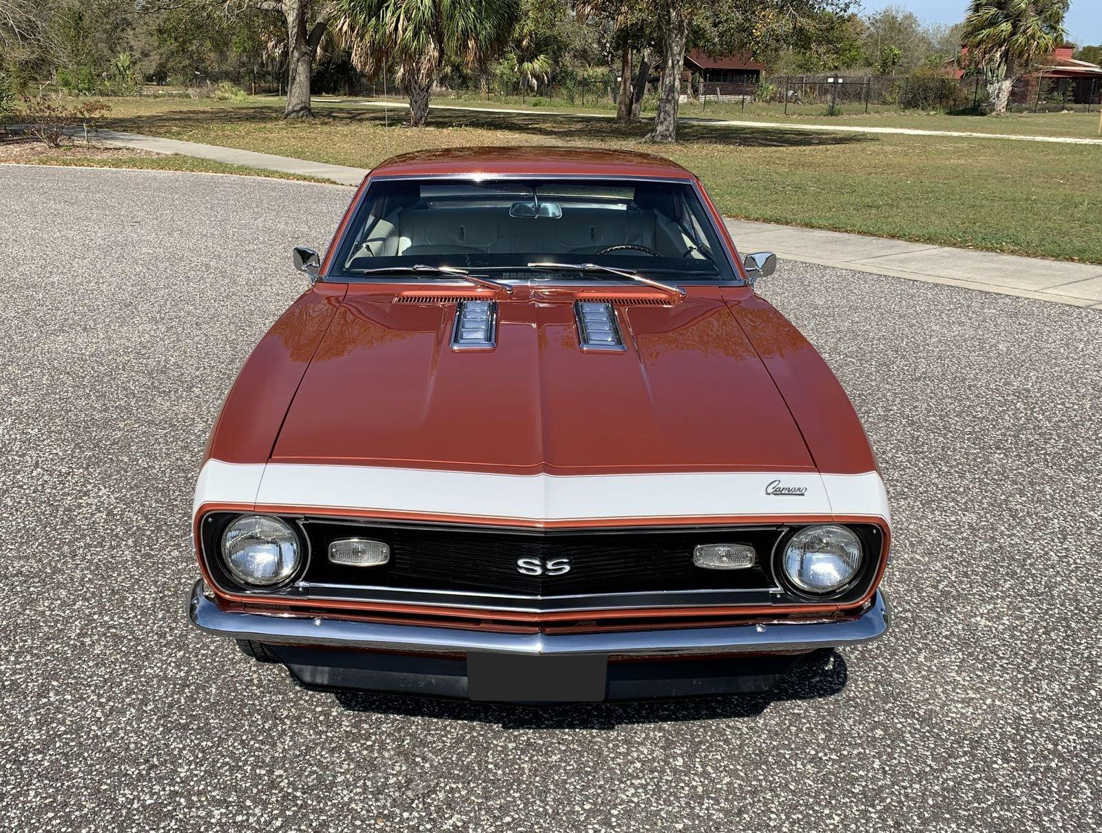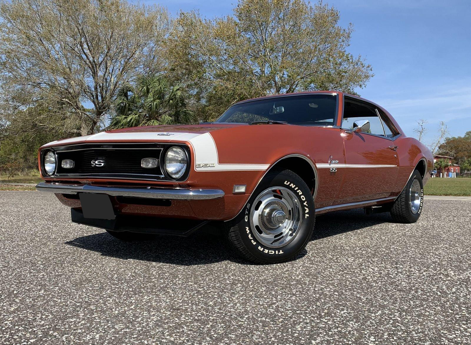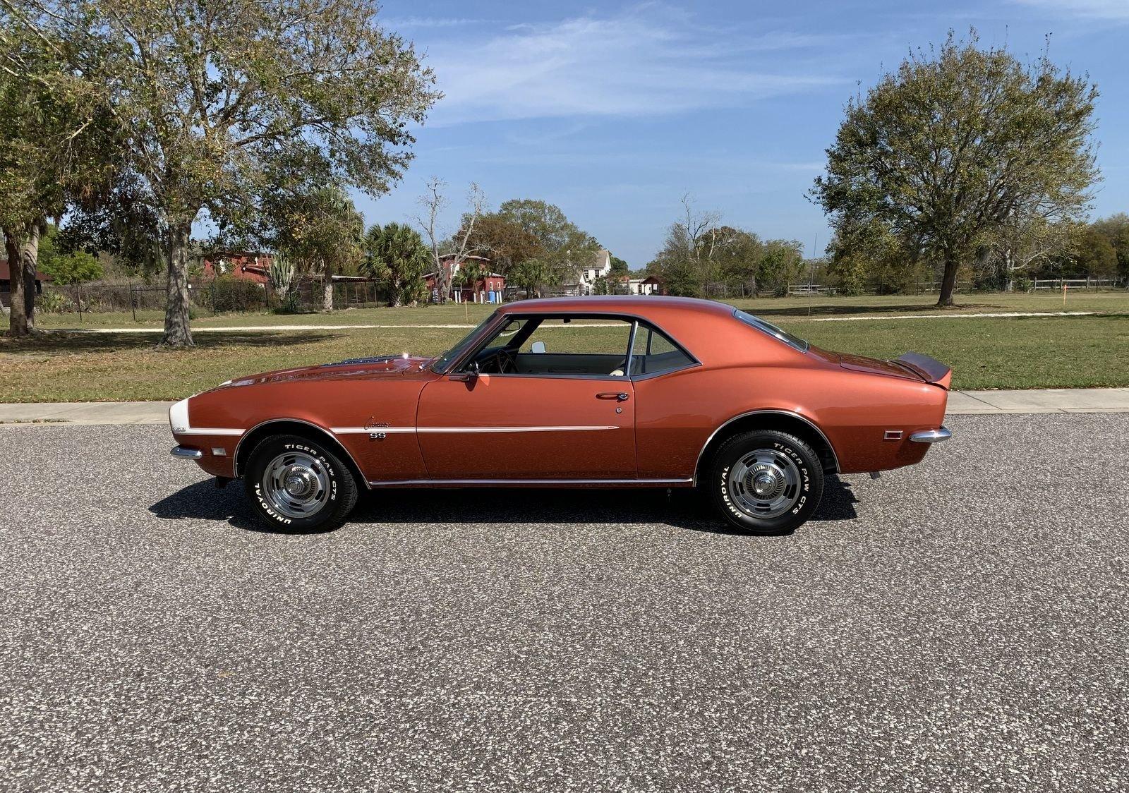 We are pleased to offer this 1968 Chevrolet Camaro SS 350 finished in rare Code 00 Corvette Bronze with white stripes. Powered by its numbers-matching L48 350 V8 factory-rated at 295 hp with a Quadrajet carburetor, snorkel air cleaner, dual exhaust, and upgraded aluminum radiator, it’s paired with a numbers-matching Muncie 4-speed manual transmission and 12-bolt posi rear with 3.31 gears. This Camaro features power steering, Wilwood front disc brakes, and 14” Rally wheels with white letter tires. The interior is equipped with Deluxe Ivory bucket seats, tachometer dash, center console with gauges, and a RetroSound AM/FM radio. With a detailed engine bay and underside, scooped hood, rear spoiler, and sport mirrors, this SS 350 is a standout example ready to show or drive.