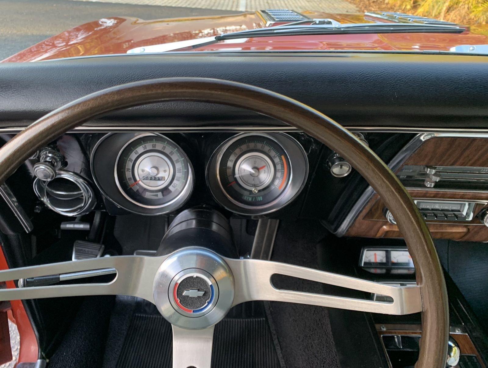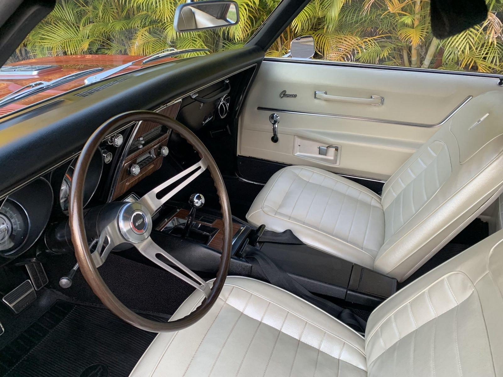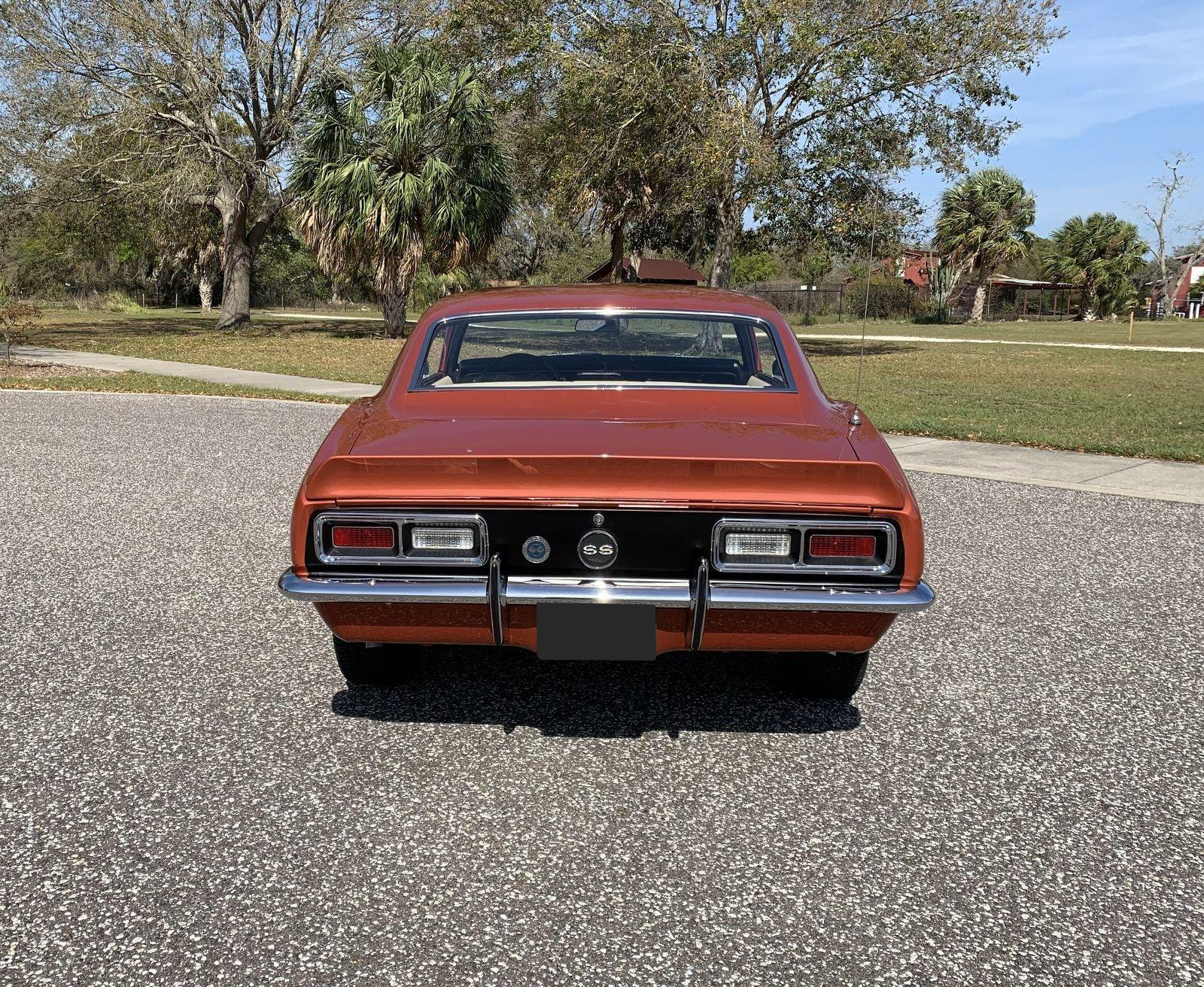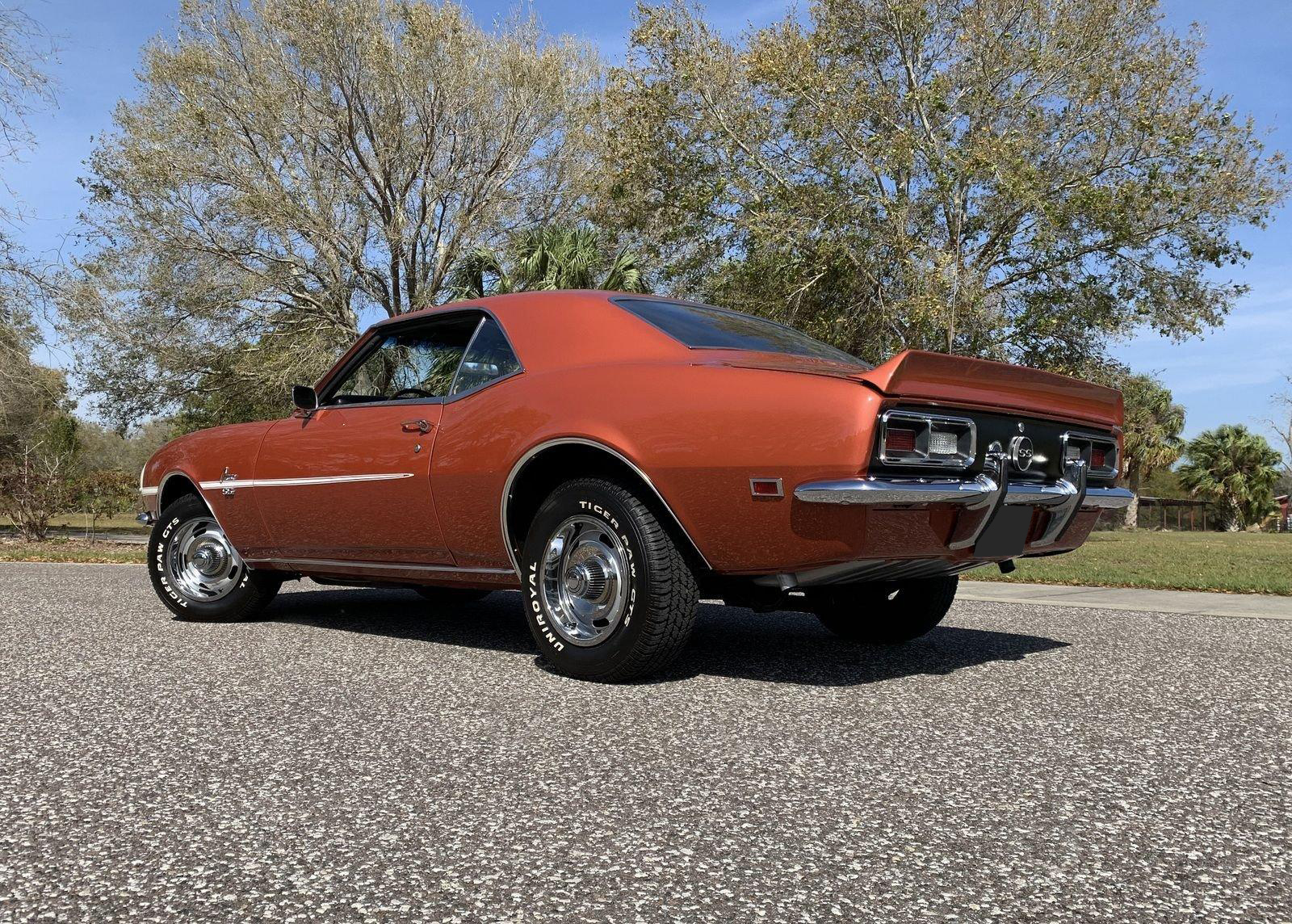 We are pleased to offer this 1968 Chevrolet Camaro SS 350 finished in rare Code 00 Corvette Bronze with white stripes. Powered by its numbers-matching L48 350 V8 factory-rated at 295 hp with a Quadrajet carburetor, snorkel air cleaner, dual exhaust, and upgraded aluminum radiator, it’s paired with a numbers-matching Muncie 4-speed manual transmission and 12-bolt posi rear with 3.31 gears. This Camaro features power steering, Wilwood front disc brakes, and 14” Rally wheels with white letter tires. The interior is equipped with Deluxe Ivory bucket seats, tachometer dash, center console with gauges, and a RetroSound AM/FM radio. With a detailed engine bay and underside, scooped hood, rear spoiler, and sport mirrors, this SS 350 is a standout example ready to show or drive.