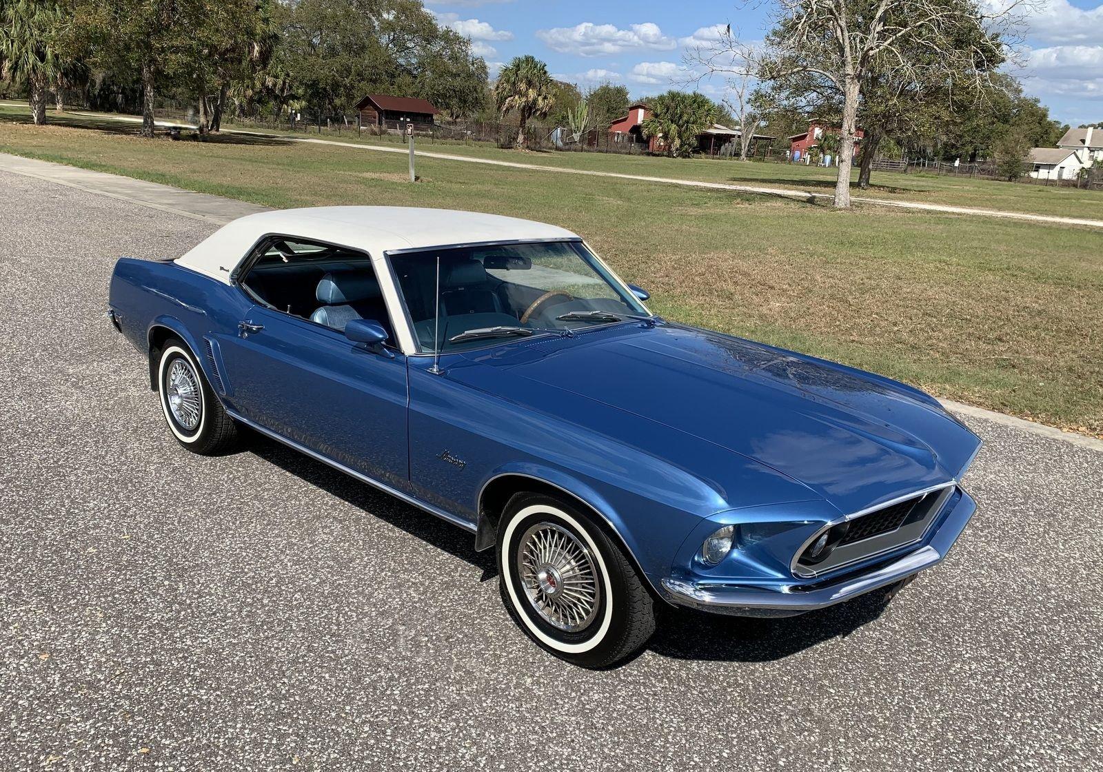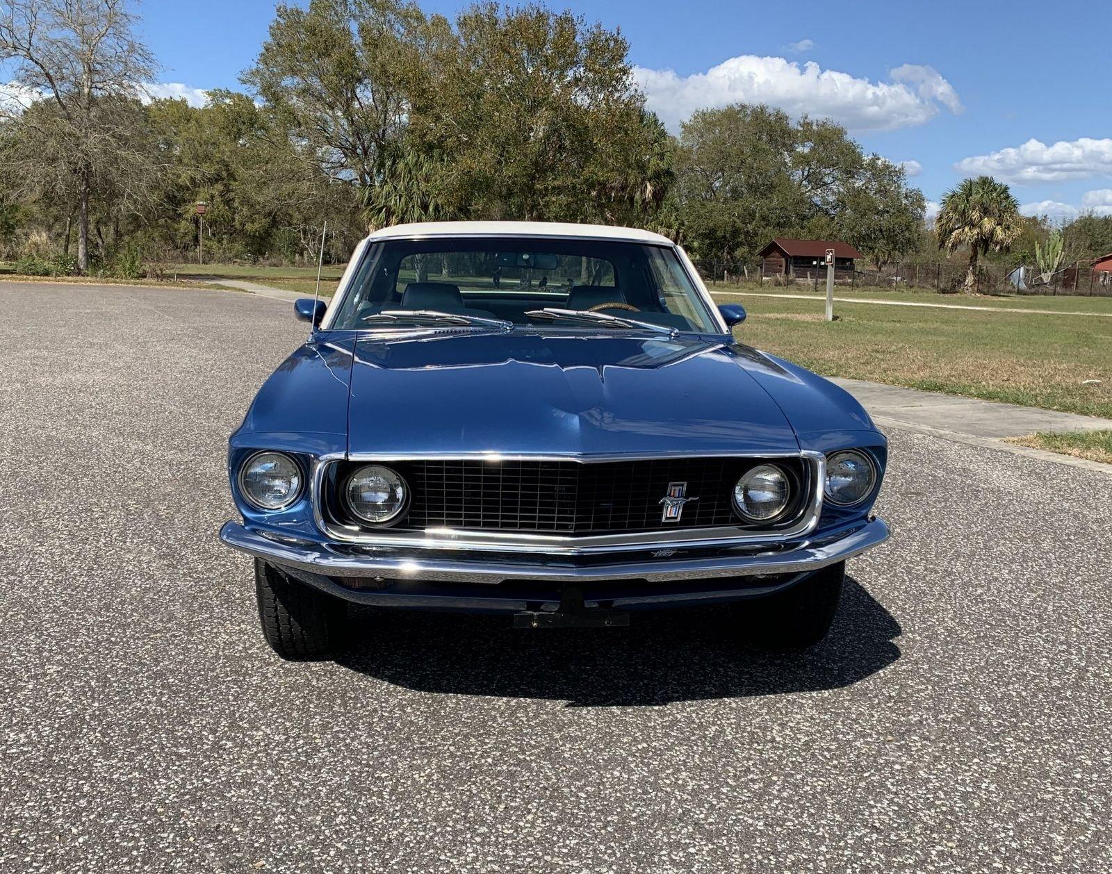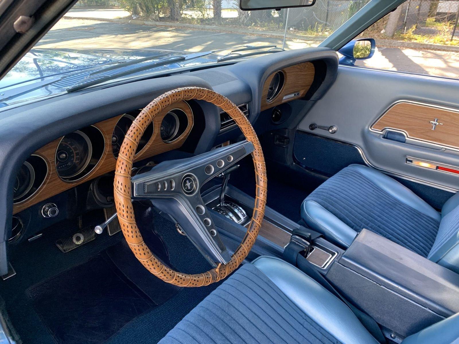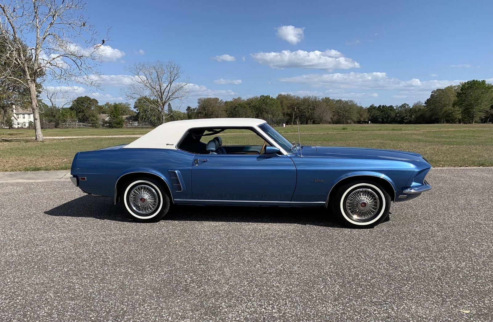 We are pleased to offer this 1969 Ford Mustang Grande for Sale. H Code 351 V8 engine, chrome engine accessories, FMX automatic transmission, 9” rear end, power steering, front power disc brakes, steel wheels with wire caps and radial white wall tires, Acapulco Blue metallic exterior, white vinyl top, factory color keyed sport mirrors, LED tail lights, blue bucket seat interior, center console, floor shifter, cold air conditioning, beautiful dash and gauges, AM/FM radio, DSO Code 72 San Jose, CA car. This Mustang looks and drives great! This Collectible First Year Grande will be an excellent addition to the family!