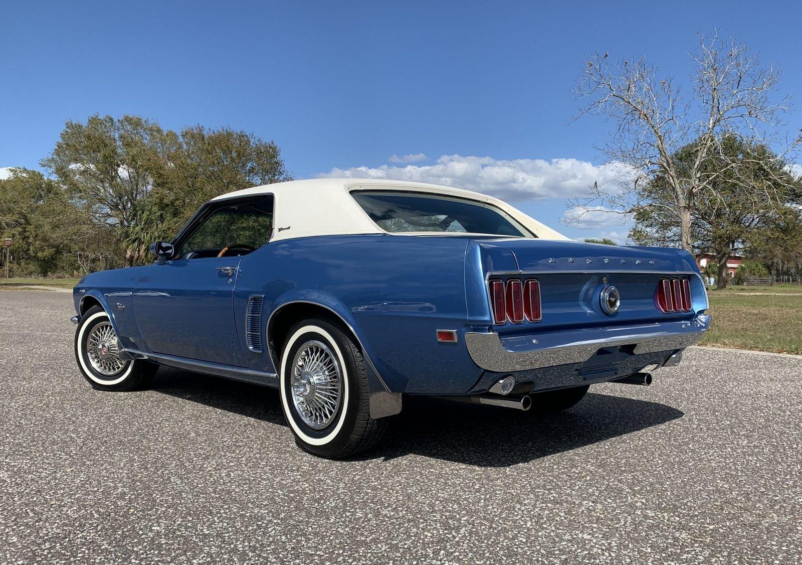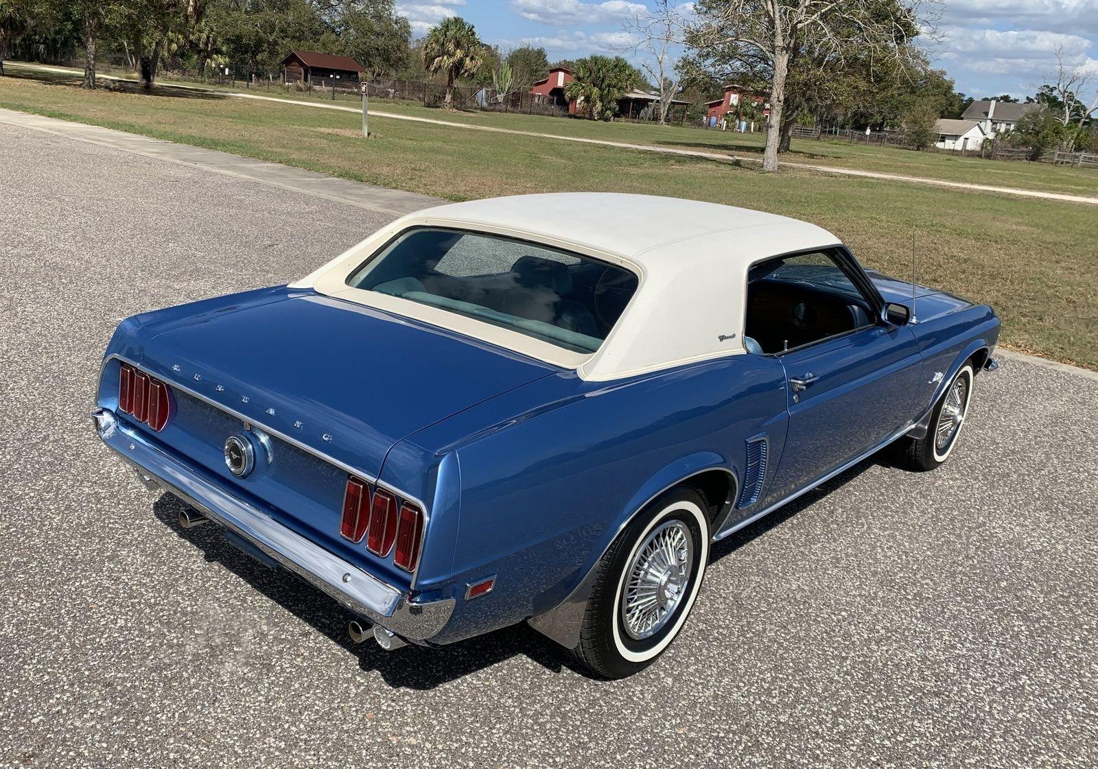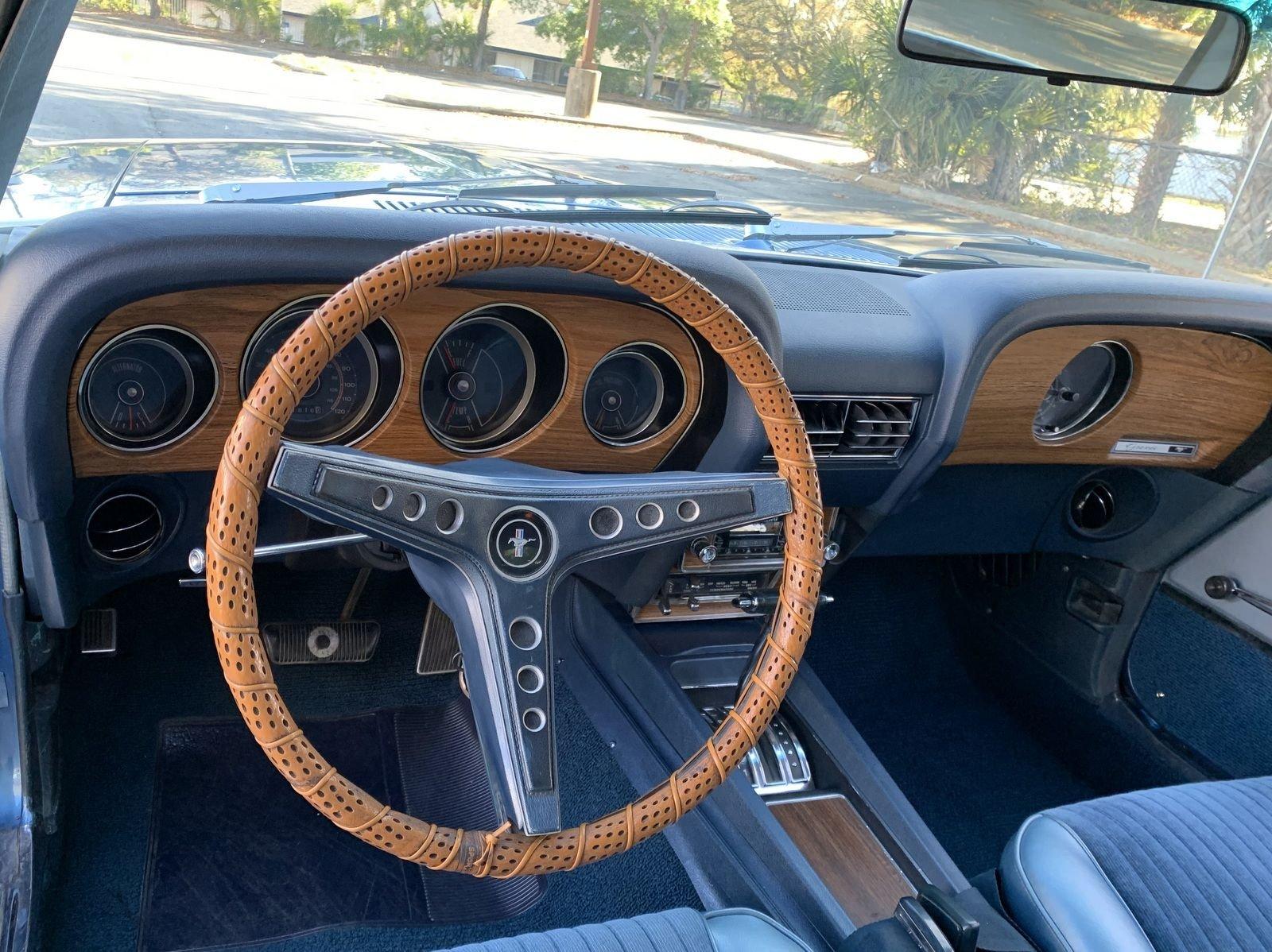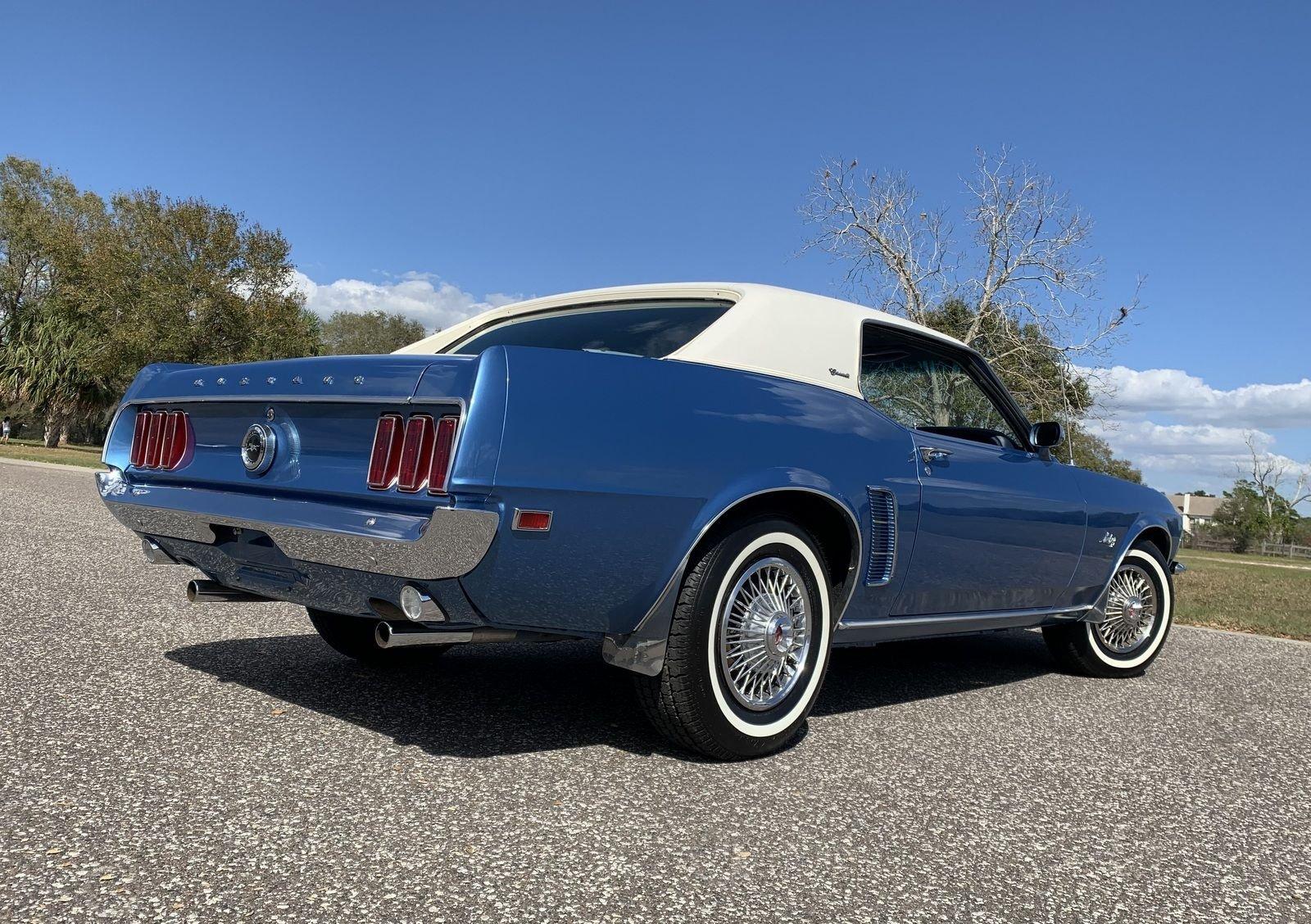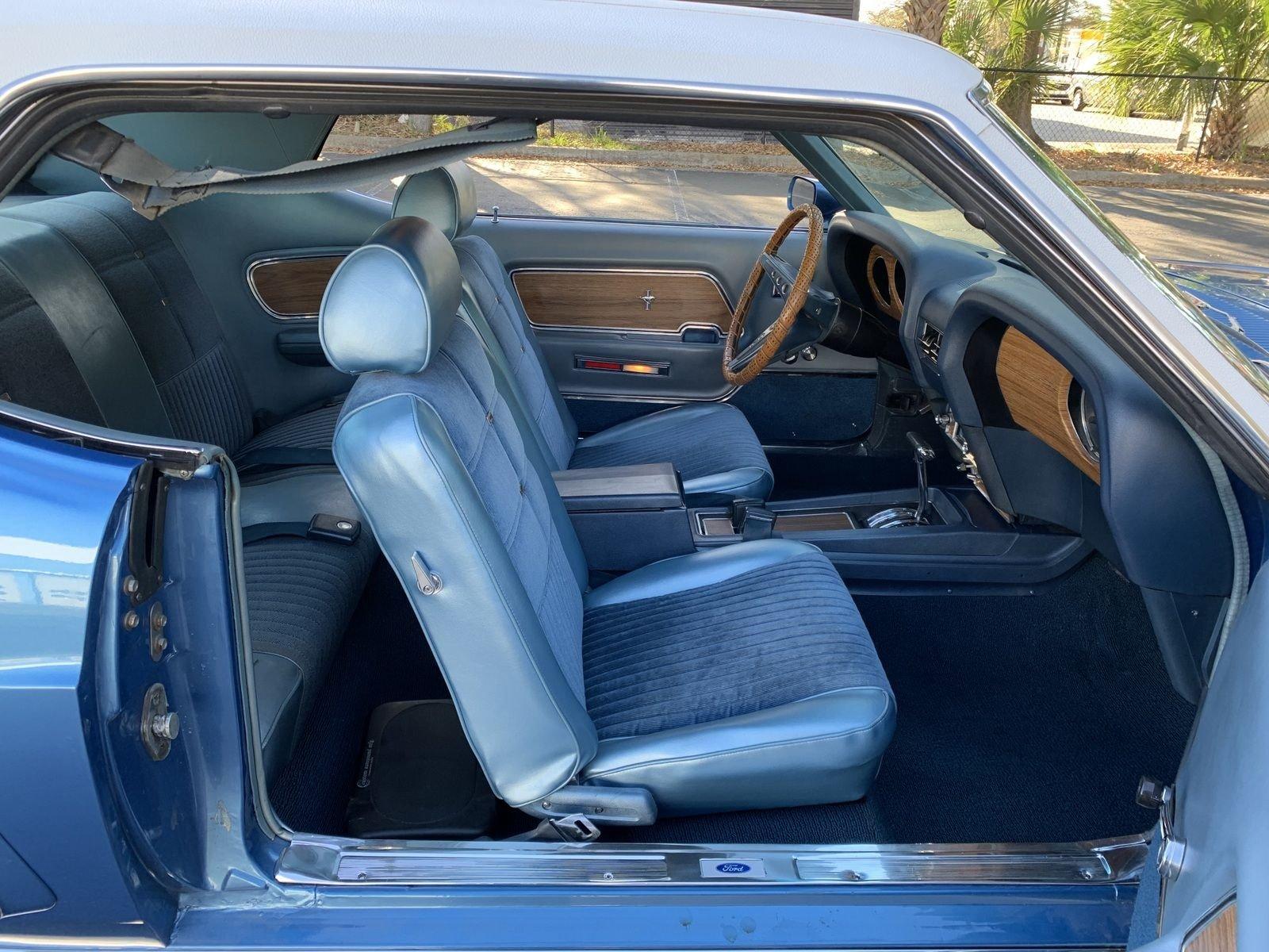 We are pleased to offer this 1969 Ford Mustang Grande for Sale. H Code 351 V8 engine, chrome engine accessories, FMX automatic transmission, 9” rear end, power steering, front power disc brakes, steel wheels with wire caps and radial white wall tires, Acapulco Blue metallic exterior, white vinyl top, factory color keyed sport mirrors, LED tail lights, blue bucket seat interior, center console, floor shifter, cold air conditioning, beautiful dash and gauges, AM/FM radio, DSO Code 72 San Jose, CA car. This Mustang looks and drives great! This Collectible First Year Grande will be an excellent addition to the family!