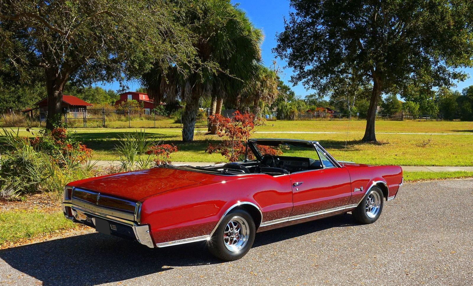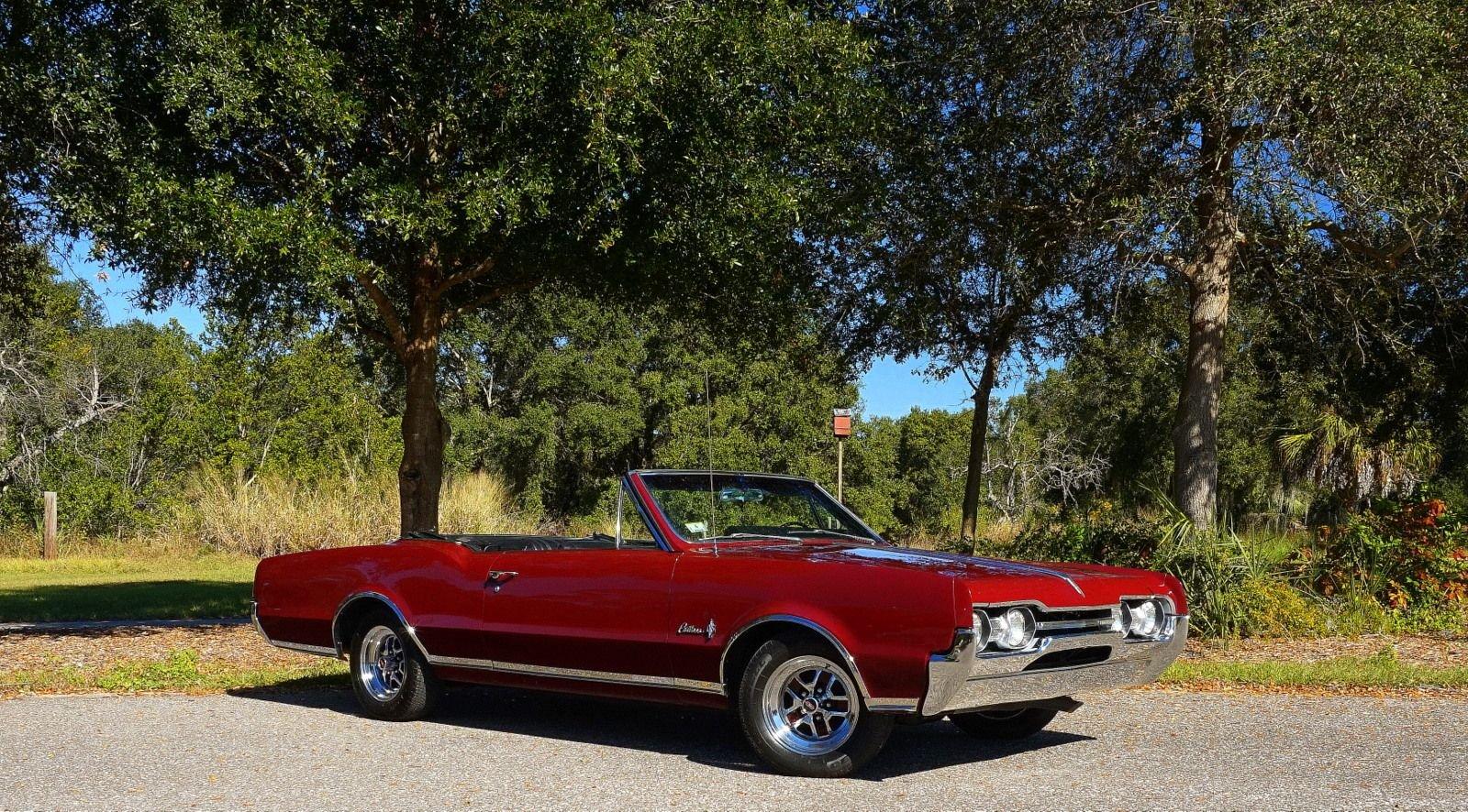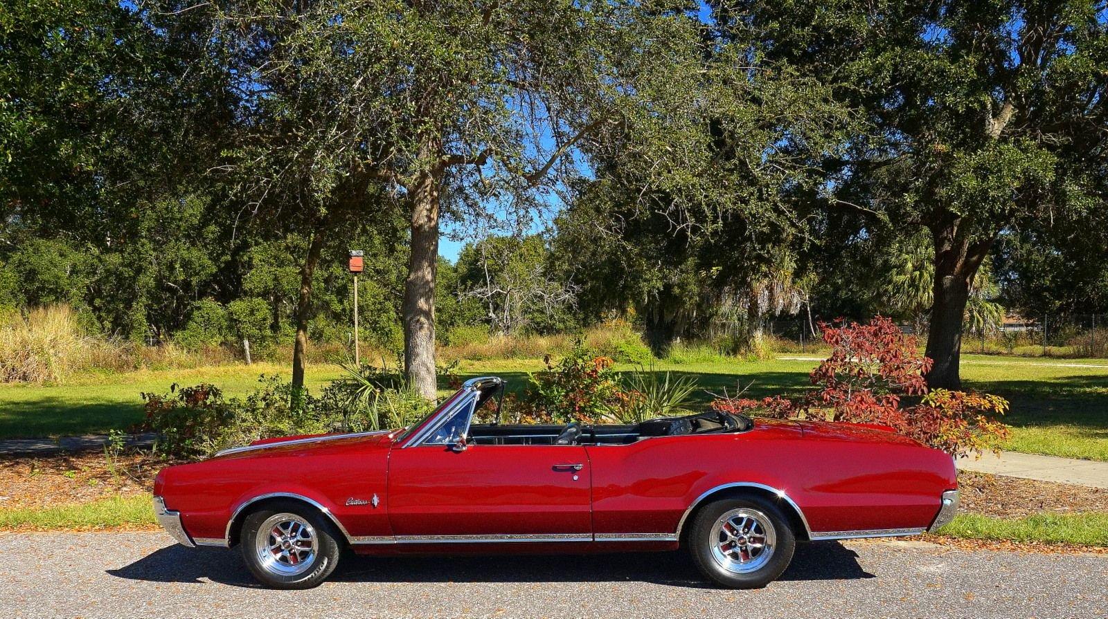 We are pleased to offer this 1967 Oldsmobile Cutlass Convertible for Sale. 330 Cu In V8 engine, automatic transmission, factory air conditioning car, 4 barrel carburetor, dual exhaust, power steering, power brakes, 15” chrome Rally Wheels with radial tires, Code N Burgundy Mist metallic exterior, driver's chrome sport mirror, black power convertible top with boot, black bucket seat interior, power windows, upgraded radio hidden in the glove box.
