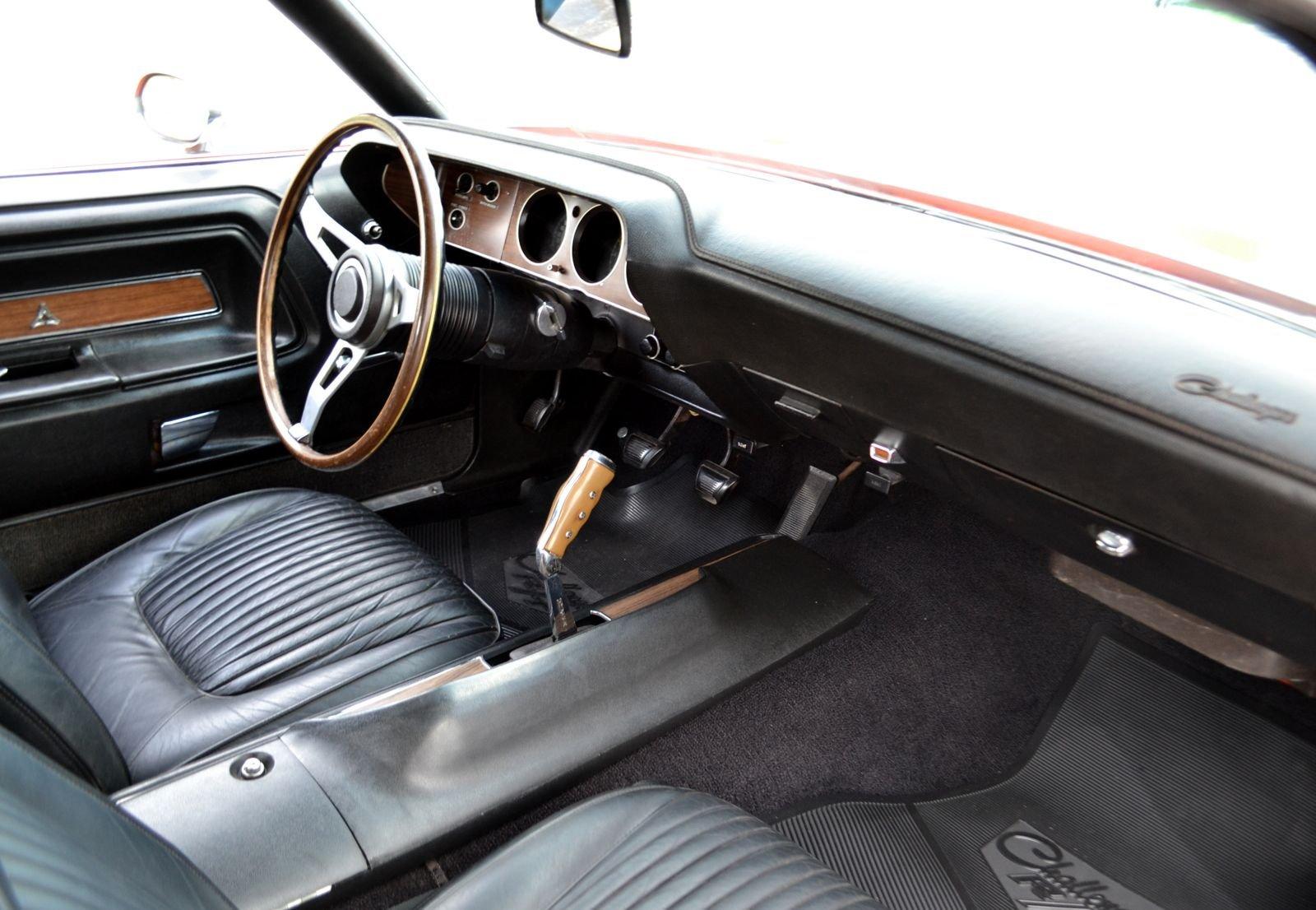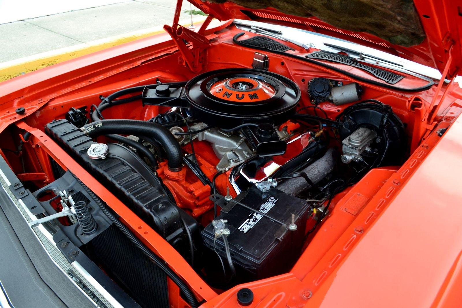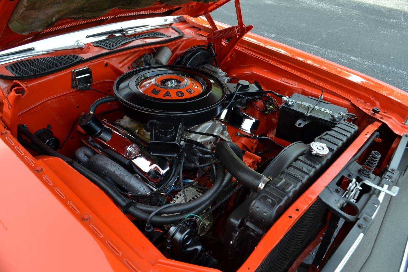 70 date coded 440 V8 engine, chrome valves covers, detailed engine bay, aluminum intake with Holley 4 barrel carburetor, dual exhaust with chrome tips, matching VIN number a833 4 speed manual transmission, Super Track Pak Dana 60 rear end, 15” chrome Magnum 500 Wheels with Hoosier white letter radial tires, front power disc brakes, SE vinyl top with small rear window, Hemi Orange exterior with black stripe package, Rallye Hood with scoops, factory equipped hood pins, rear deck spoiler, driver's remote racing mirror, flip top fuel cap, beautiful black leather SE high back bucket seat interior, center console, Hurst Pistol Grip Shifter, overhead consolette, wood grain Rallye Dash. Believed to be 81K original miles. Make this RARE '70 E-Body Super Track Pak 4 Speed Mopar yours today!