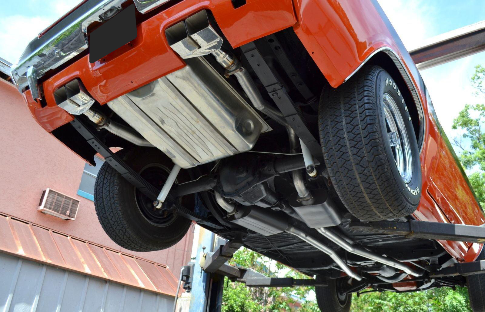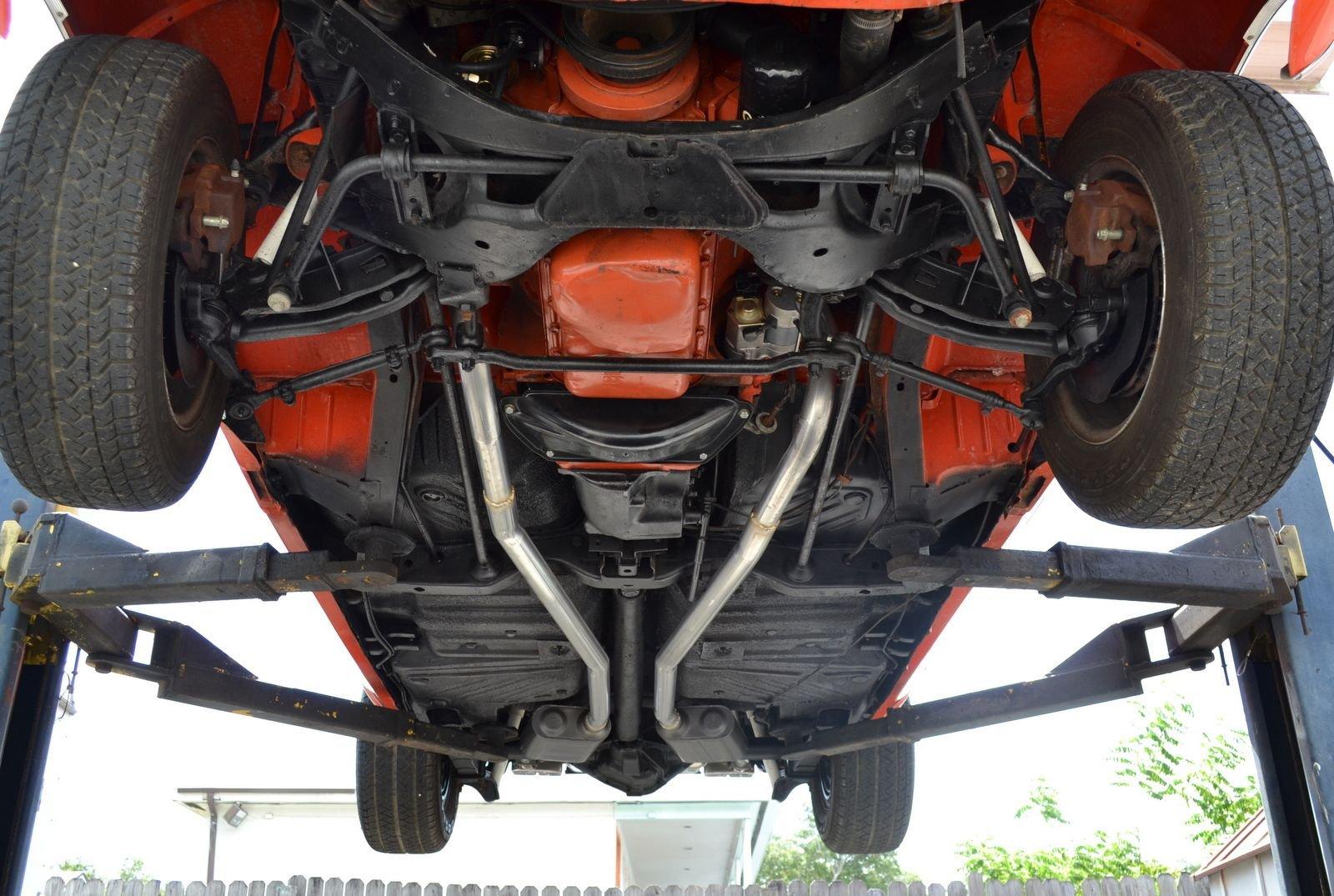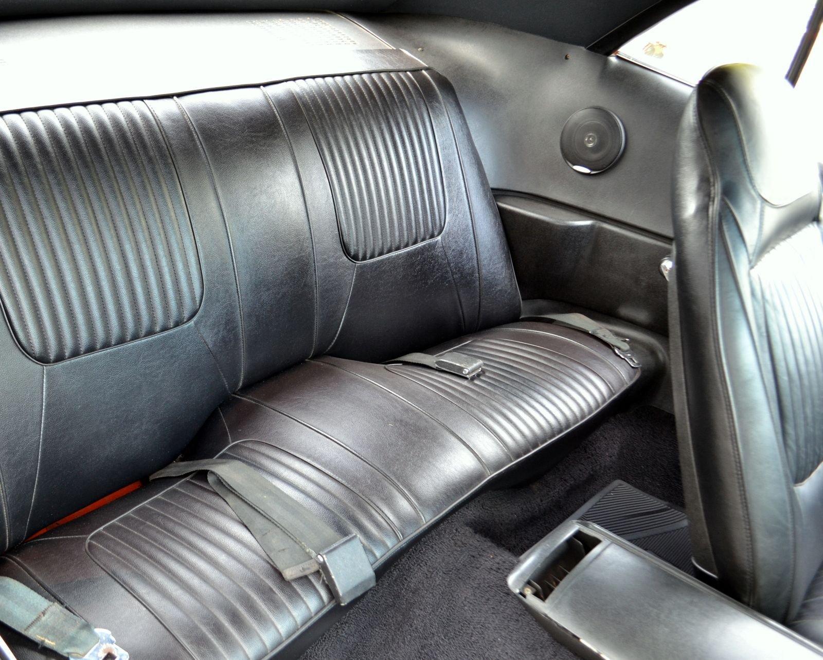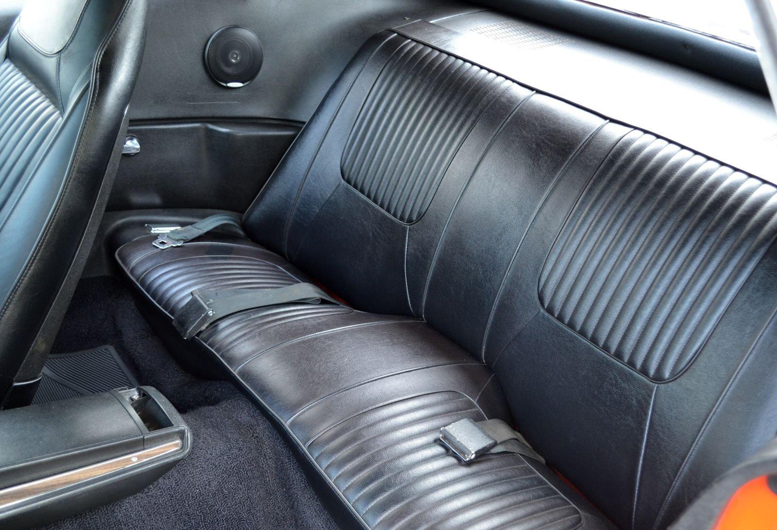 70 date coded 440 V8 engine, chrome valves covers, detailed engine bay, aluminum intake with Holley 4 barrel carburetor, dual exhaust with chrome tips, matching VIN number a833 4 speed manual transmission, Super Track Pak Dana 60 rear end, 15” chrome Magnum 500 Wheels with Hoosier white letter radial tires, front power disc brakes, SE vinyl top with small rear window, Hemi Orange exterior with black stripe package, Rallye Hood with scoops, factory equipped hood pins, rear deck spoiler, driver's remote racing mirror, flip top fuel cap, beautiful black leather SE high back bucket seat interior, center console, Hurst Pistol Grip Shifter, overhead consolette, wood grain Rallye Dash. Believed to be 81K original miles. Make this RARE '70 E-Body Super Track Pak 4 Speed Mopar yours today!