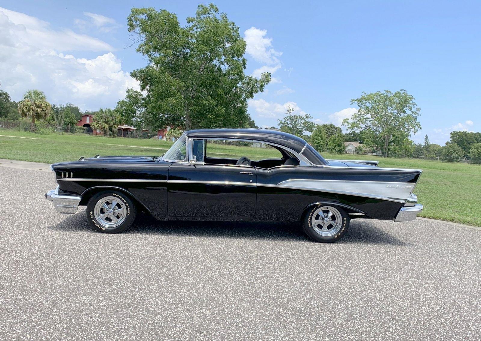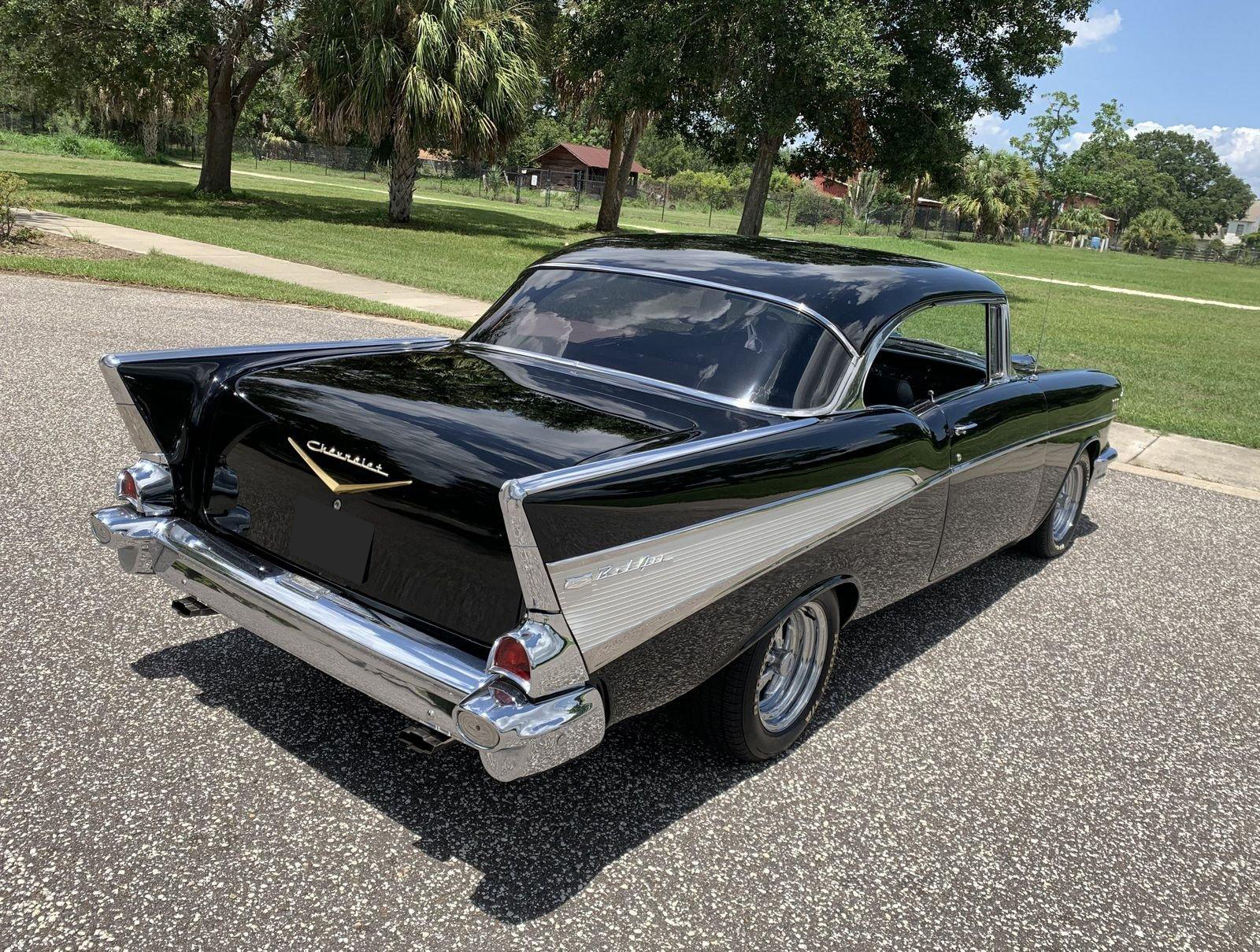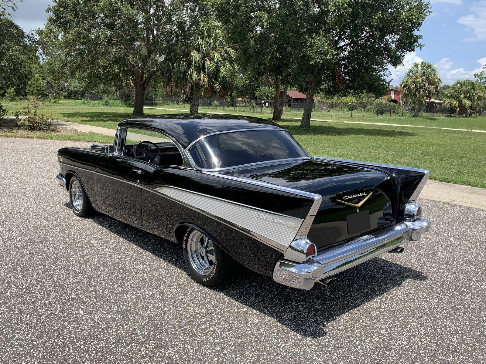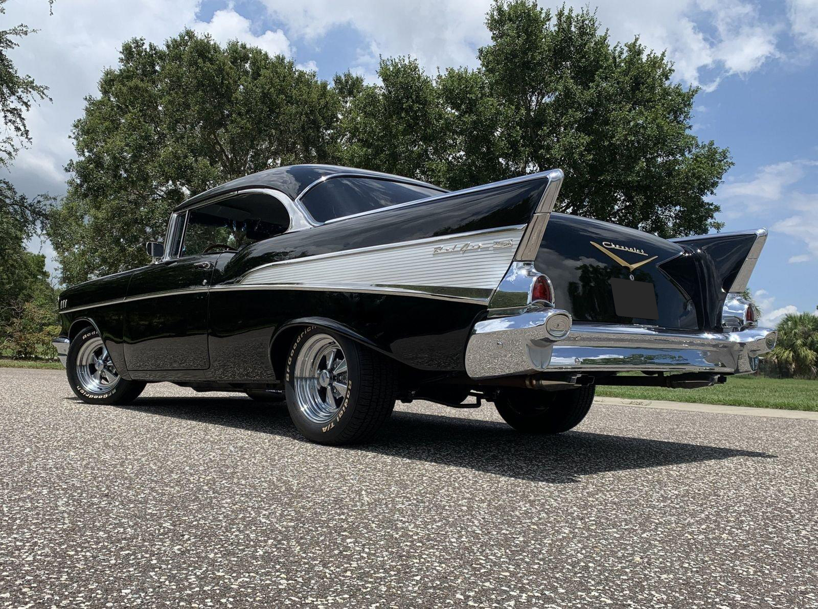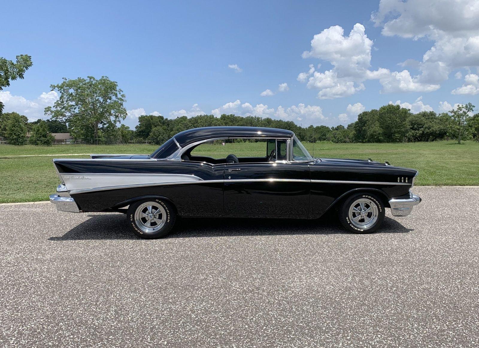 We are pleased to offer this 1957 Chevrolet Bel Air Restomod Hardtop for Sale. This Black Beauty is ready to enjoy! Powered by a 327 Cu In V8 with an Edelbrock aluminum intake and Edelbrock 4 barrel carb, MSD Ignition, engine dress up kit, aluminum radiator and completed by headers into throaty dual exhaust all in a detailed engine bay. It's mated to a 4 speed manual transmission with Hurst Shifter and equipped with power steering, power disc brakes and air conditioning. The interior has a beautiful black custom bench seat, Ididit tilt steering column, Lecarra wood grain steering wheel, AM/FM cassette radio and Bosch Tach. The car's straight body is accented by great margins, clear glass, brilliant moldings and hi-gloss chrome. The rear suspension can be adjusted with air shocks to give the car the stance desired, raised for an aggressive appearance or lowered for cruising. The car rolls on a set of Cragar Wheels carrying BF Goodrich raised white letter radials 225/60R 14's on the front with a little wider 245/60R 14's on the rear to assist with the car's handling.