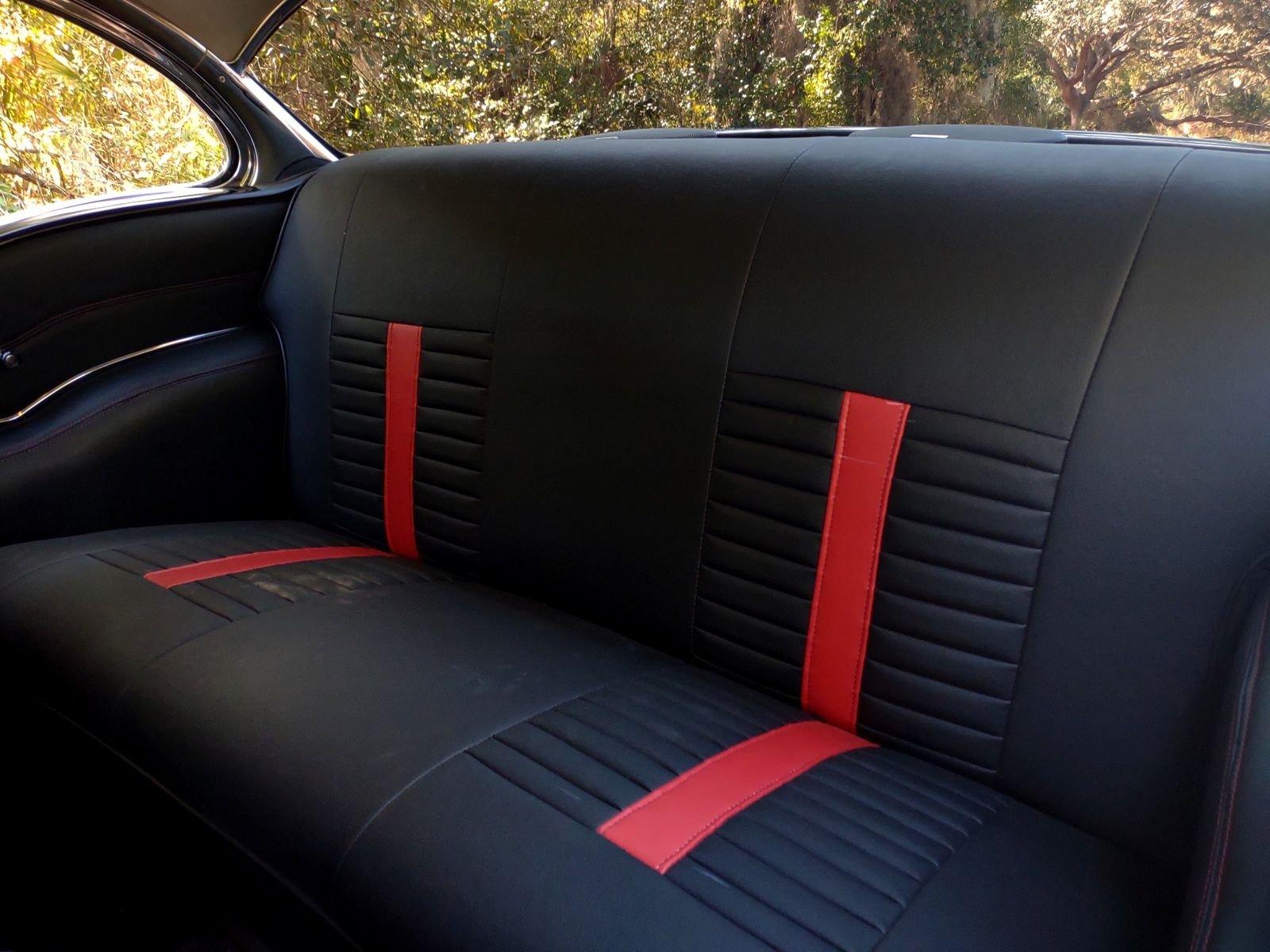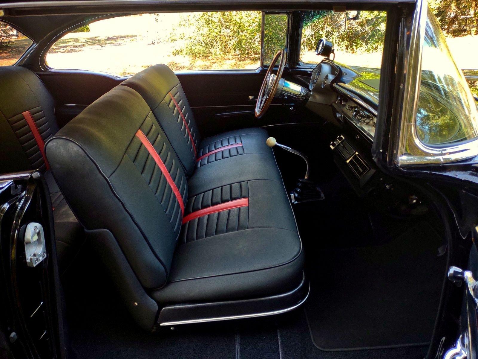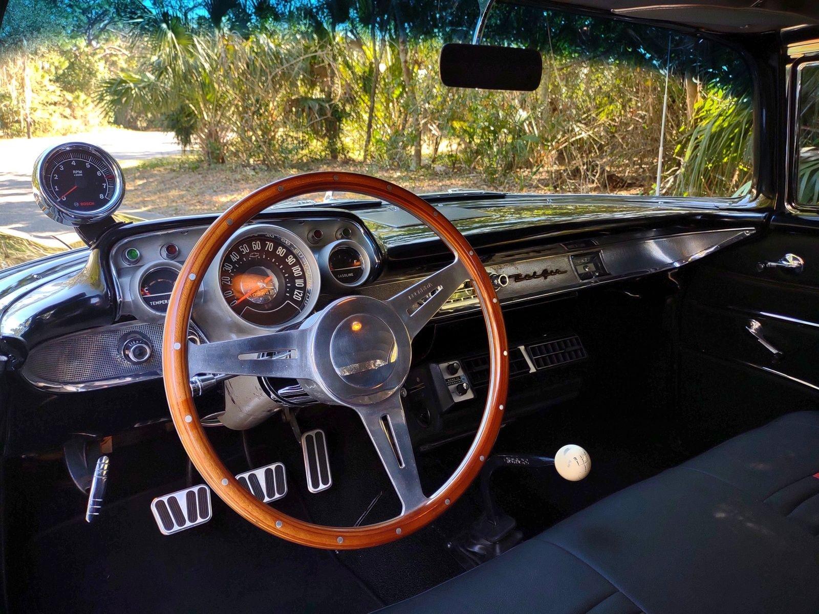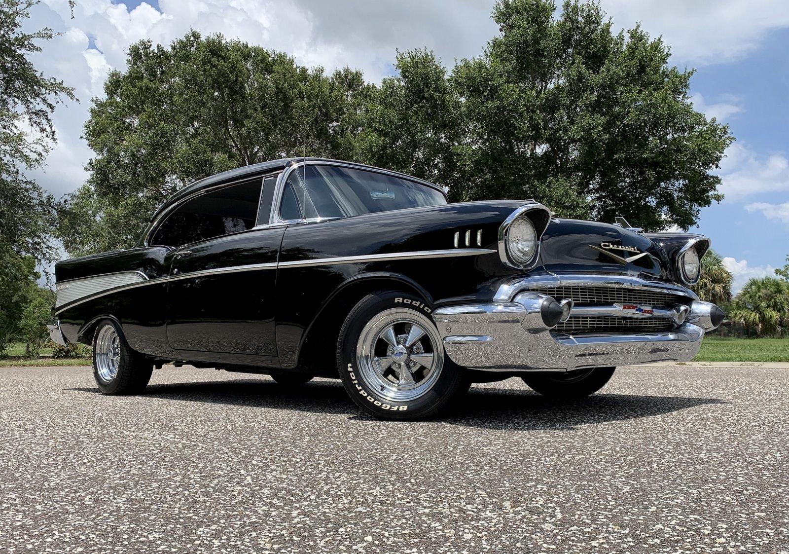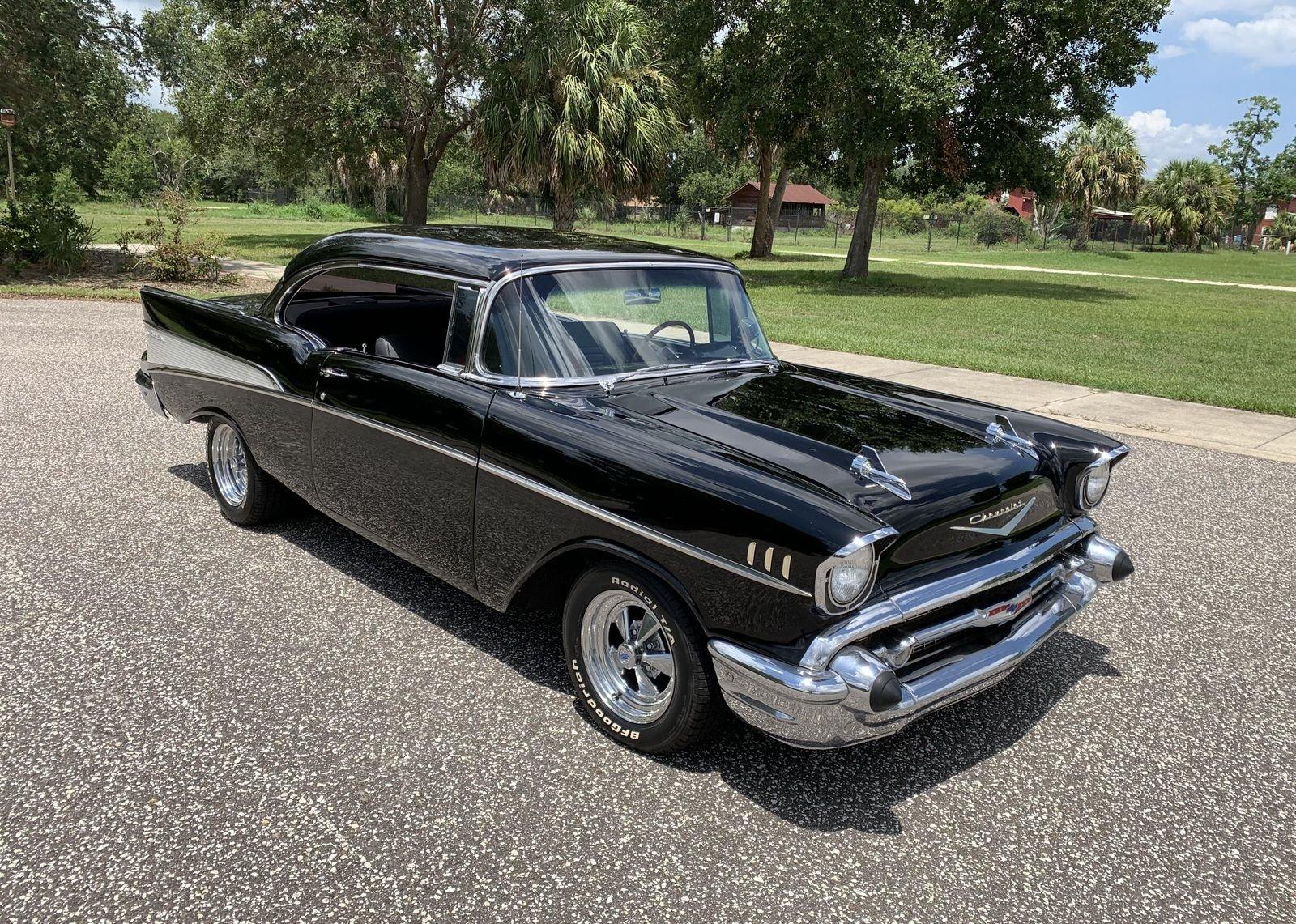We are pleased to offer this 1957 Chevrolet Bel Air Restomod Hardtop for Sale. This Black Beauty is ready to enjoy! Powered by a 327 Cu In V8 with an Edelbrock aluminum intake and Edelbrock 4 barrel carb, MSD Ignition, engine dress up kit, aluminum radiator and completed by headers into throaty dual exhaust all in a detailed engine bay. It's mated to a 4 speed manual transmission with Hurst Shifter and equipped with power steering, power disc brakes and air conditioning. The interior has a beautiful black custom bench seat, Ididit tilt steering column, Lecarra wood grain steering wheel, AM/FM cassette radio and Bosch Tach. The car's straight body is accented by great margins, clear glass, brilliant moldings and hi-gloss chrome. The rear suspension can be adjusted with air shocks to give the car the stance desired, raised for an aggressive appearance or lowered for cruising. The car rolls on a set of Cragar Wheels carrying BF Goodrich raised white letter radials 225/60R 14's on the front with a little wider 245/60R 14's on the rear to assist with the car's handling.