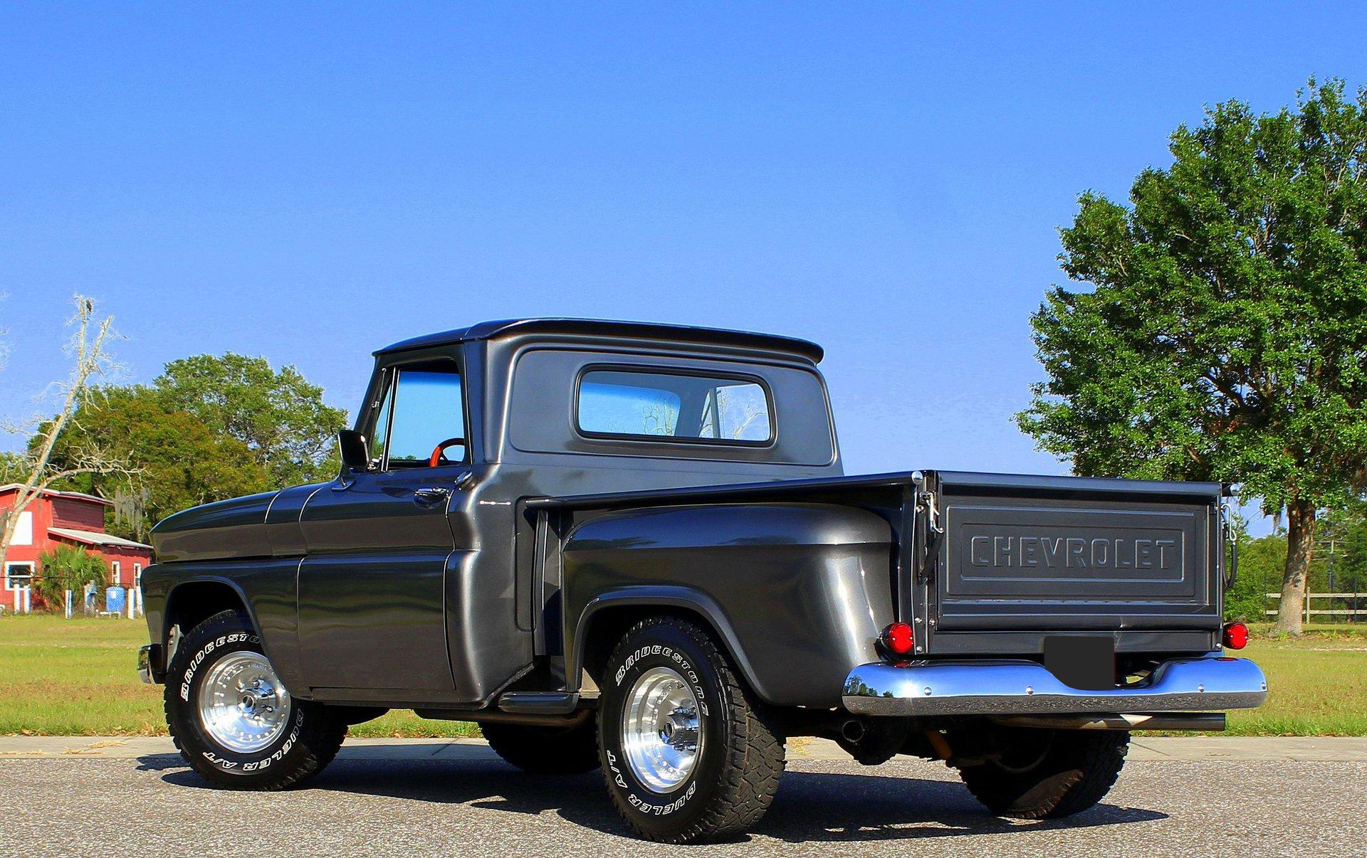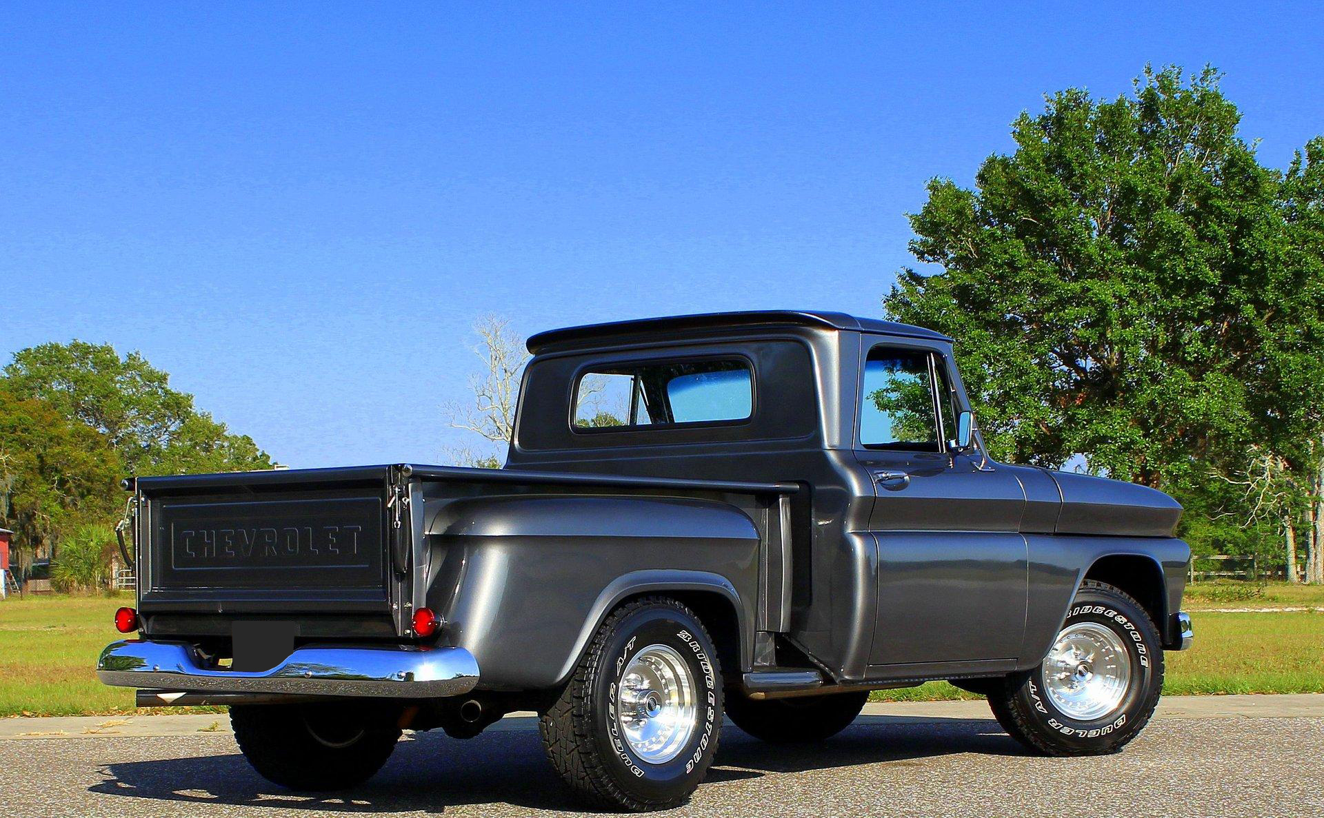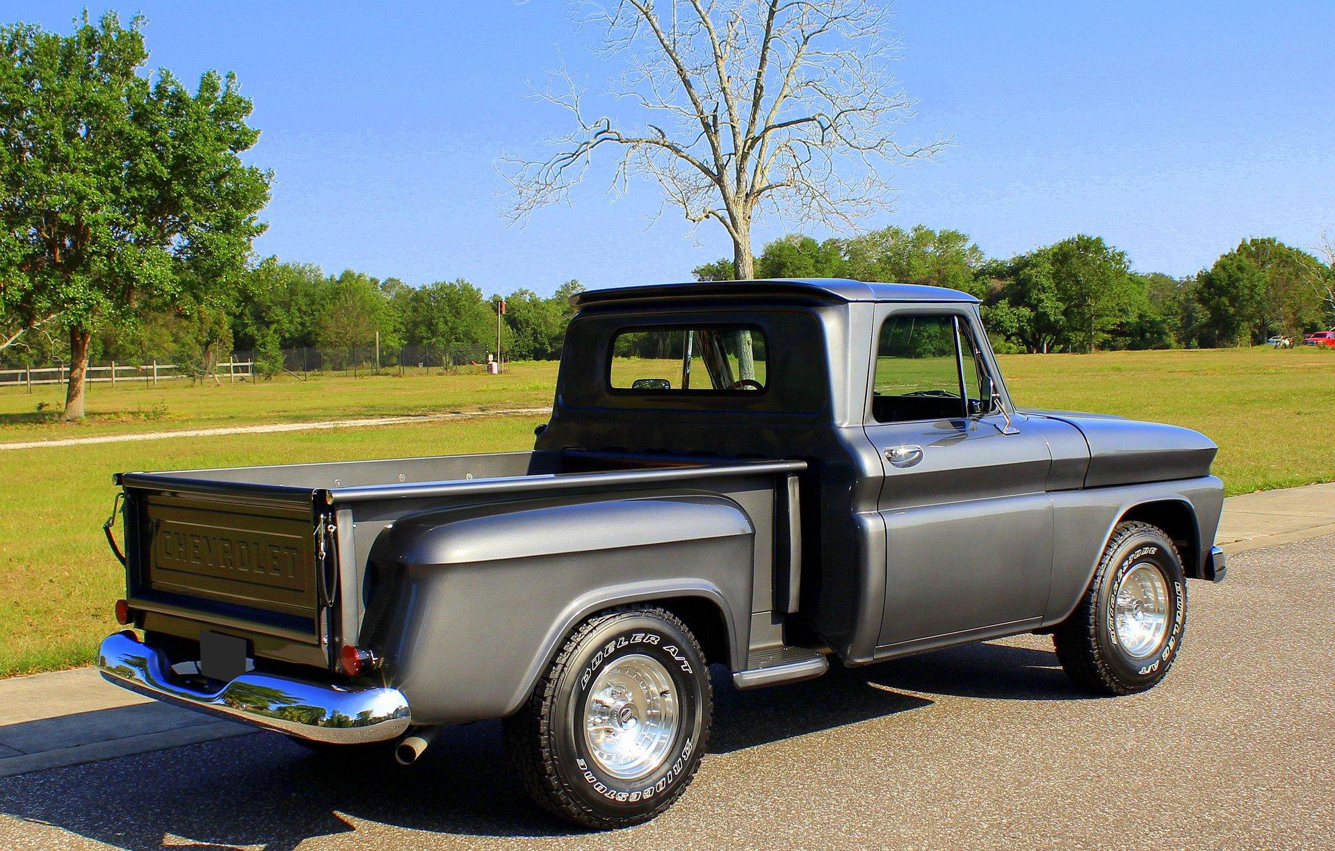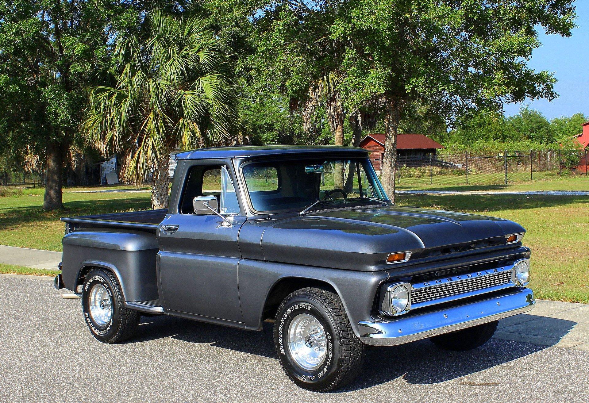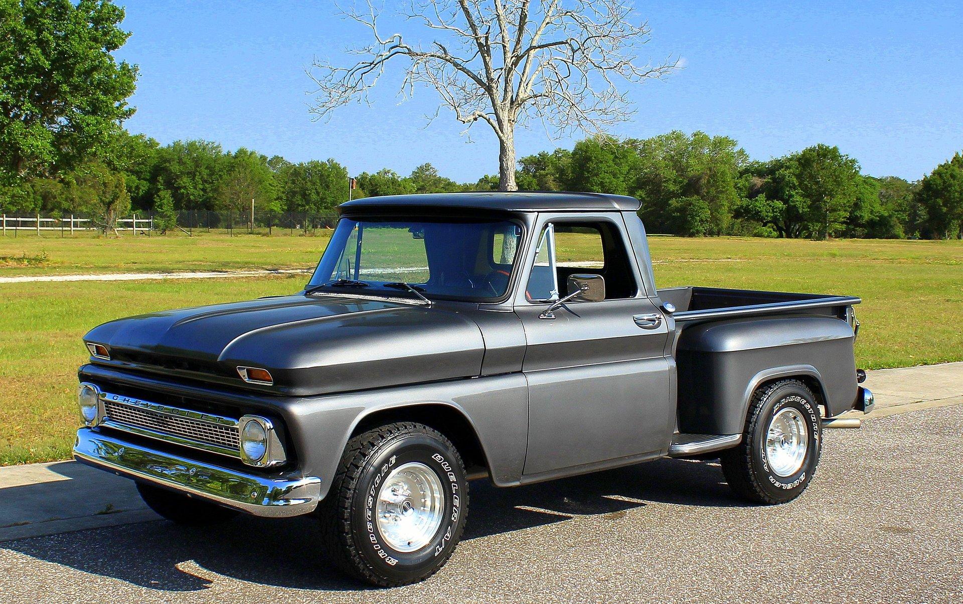 We are pleased to offer this 1966 Chevy C10 Stepside Pickup for Sale. Restored and ready to roll! Finished in a silver gray metallic. Accented by amazing chrome, bumpers, grille, mirrors and even the sill plates on the interior have been replaced to give this popular Pickup an outstanding appearance! Powered by a 350 Cu In V8 mated to an automatic transmission. Equipped with power steering and power disc brakes. The straight body has great margins and is completed by a restored wood floor bed and new chrome strips. The engine bay has been detailed and subtle items have been added such as aluminum valve covers, chrome air breather and the most noticeable upgrade an aluminum radiator with electric fan. The interior has retained a more traditional appearance with a black bench seat, replaced rubber floor mat, standard radio and the addition of a wood grain steering wheel. The dash and gauge cluster have also been restored. This C10 rolls on a set of polished solid aluminum American Racing Wheels carrying Bridgestone raised white letter all terrain tires in 31X10/50R 15LT.