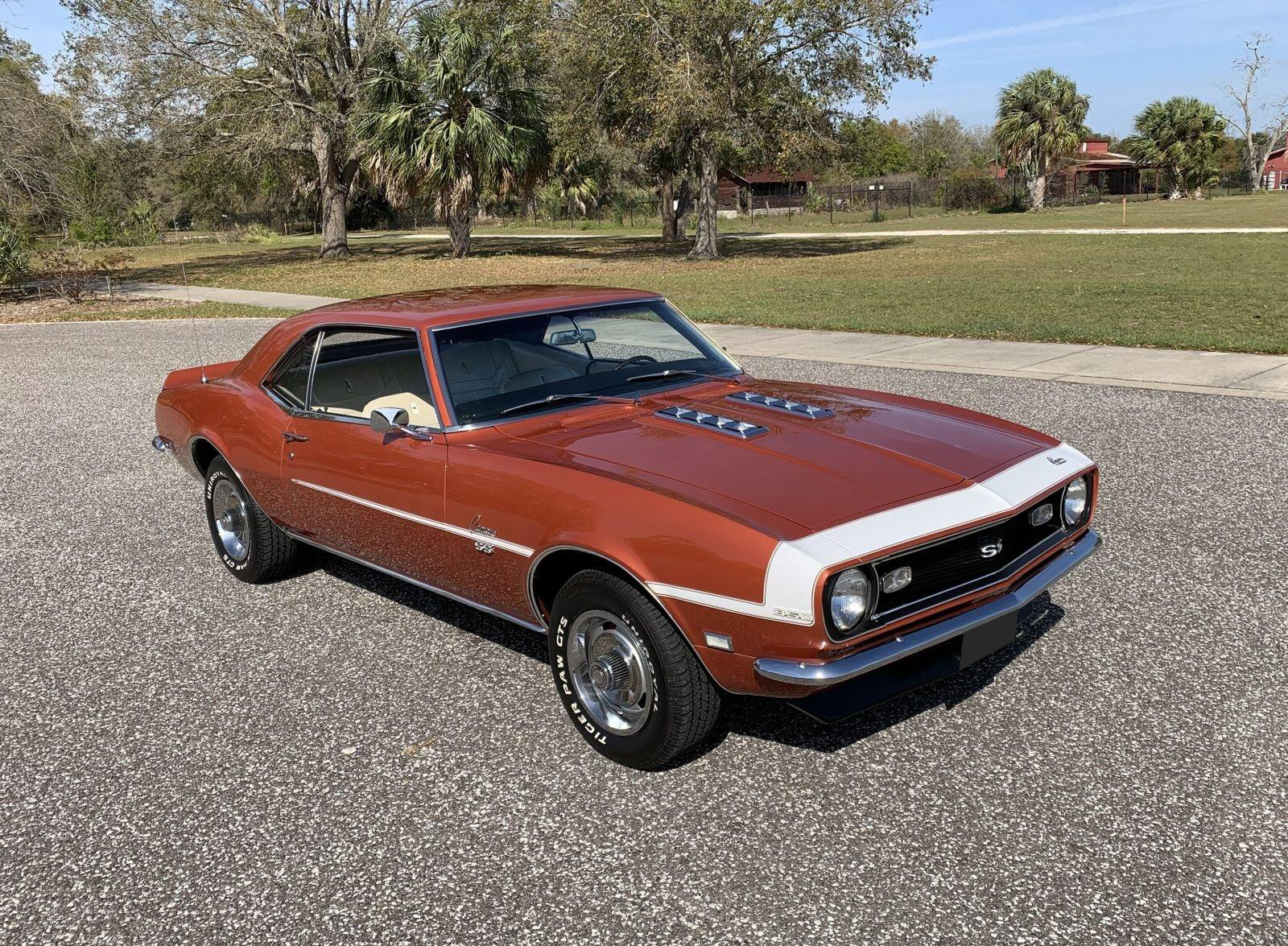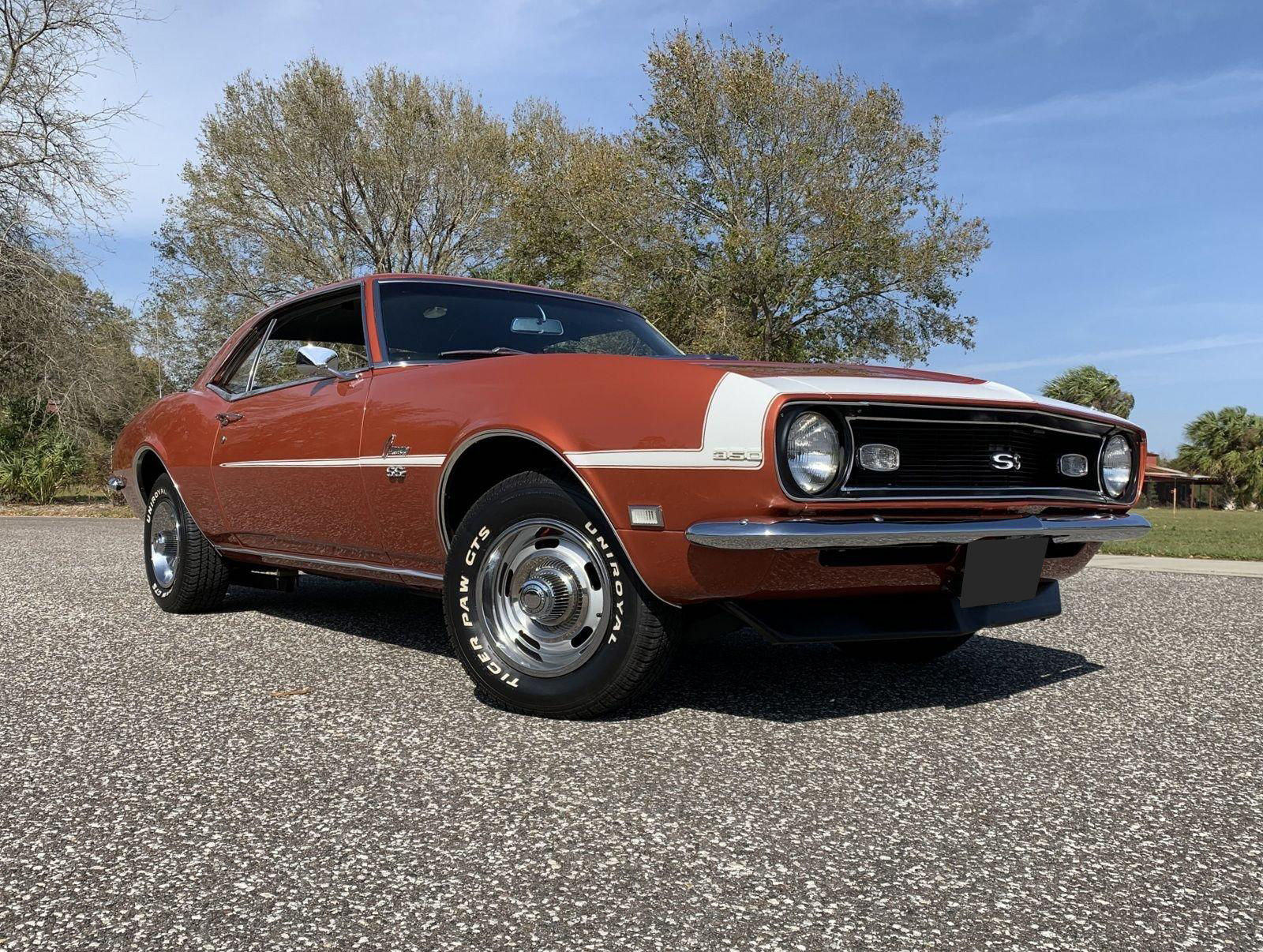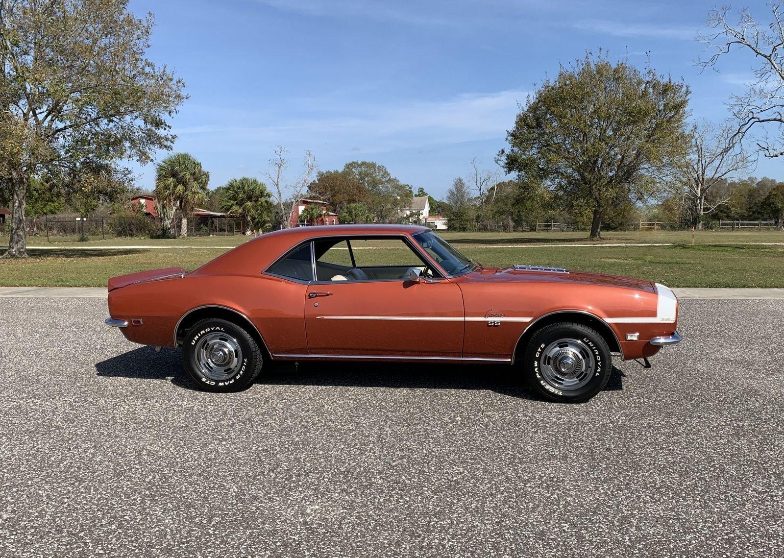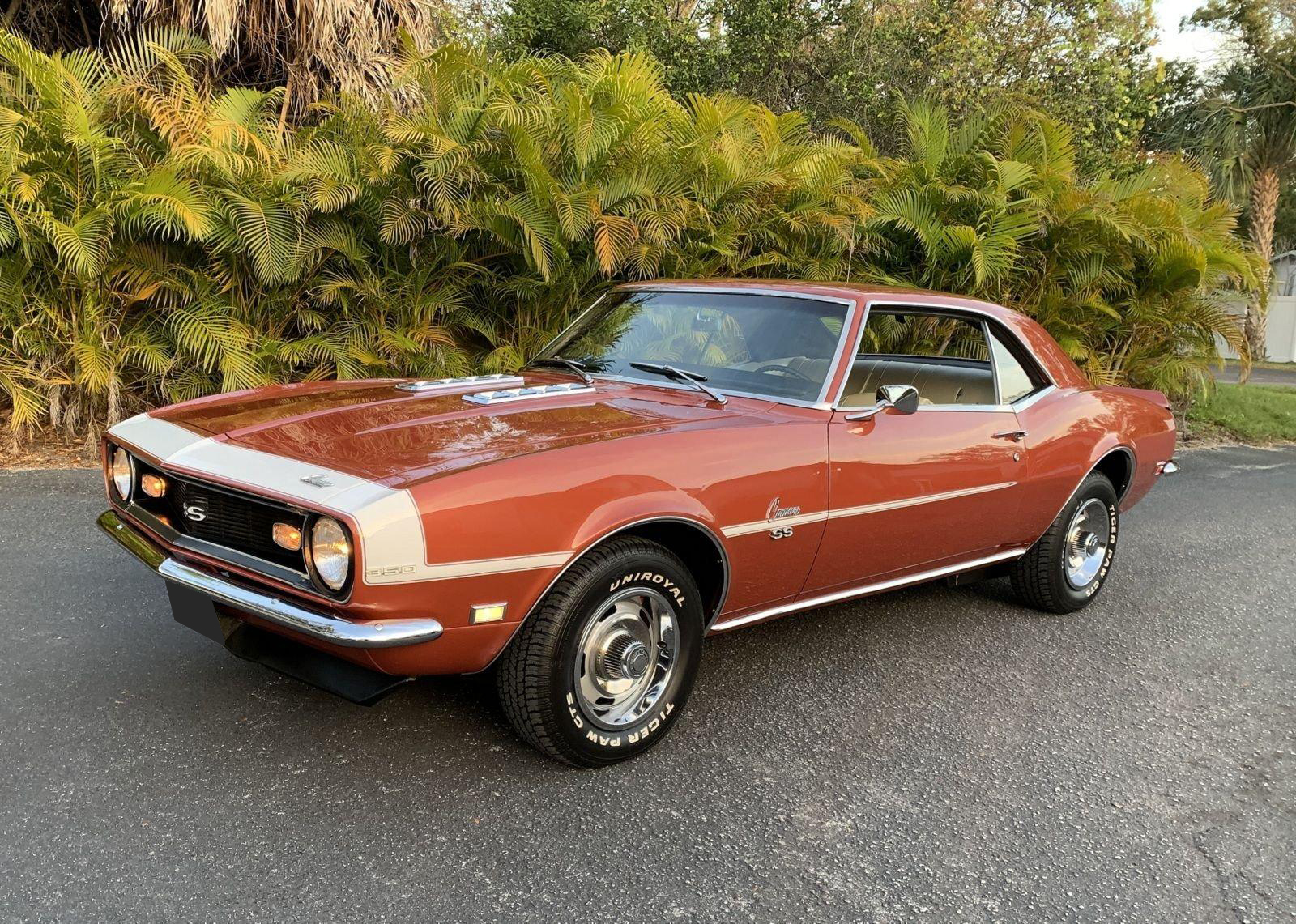 We are pleased to offer this 1968 Chevrolet Camaro SS 350 finished in rare Code 00 Corvette Bronze with white stripes. Powered by its numbers-matching L48 350 V8 factory-rated at 295 hp with a Quadrajet carburetor, snorkel air cleaner, dual exhaust, and upgraded aluminum radiator, it’s paired with a numbers-matching Muncie 4-speed manual transmission and 12-bolt posi rear with 3.31 gears. This Camaro features power steering, Wilwood front disc brakes, and 14” Rally wheels with white letter tires. The interior is equipped with Deluxe Ivory bucket seats, tachometer dash, center console with gauges, and a RetroSound AM/FM radio. With a detailed engine bay and underside, scooped hood, rear spoiler, and sport mirrors, this SS 350 is a standout example ready to show or drive.