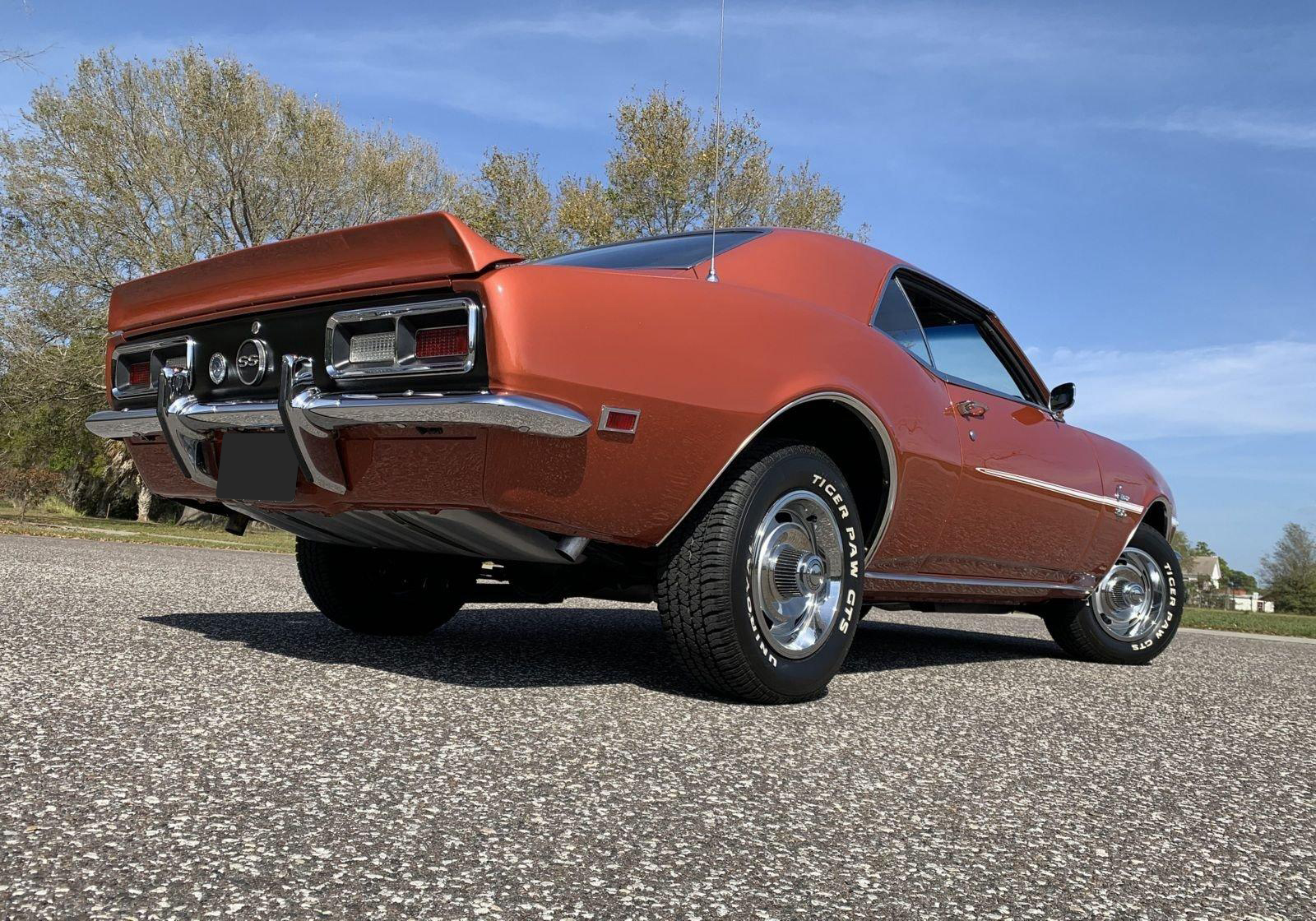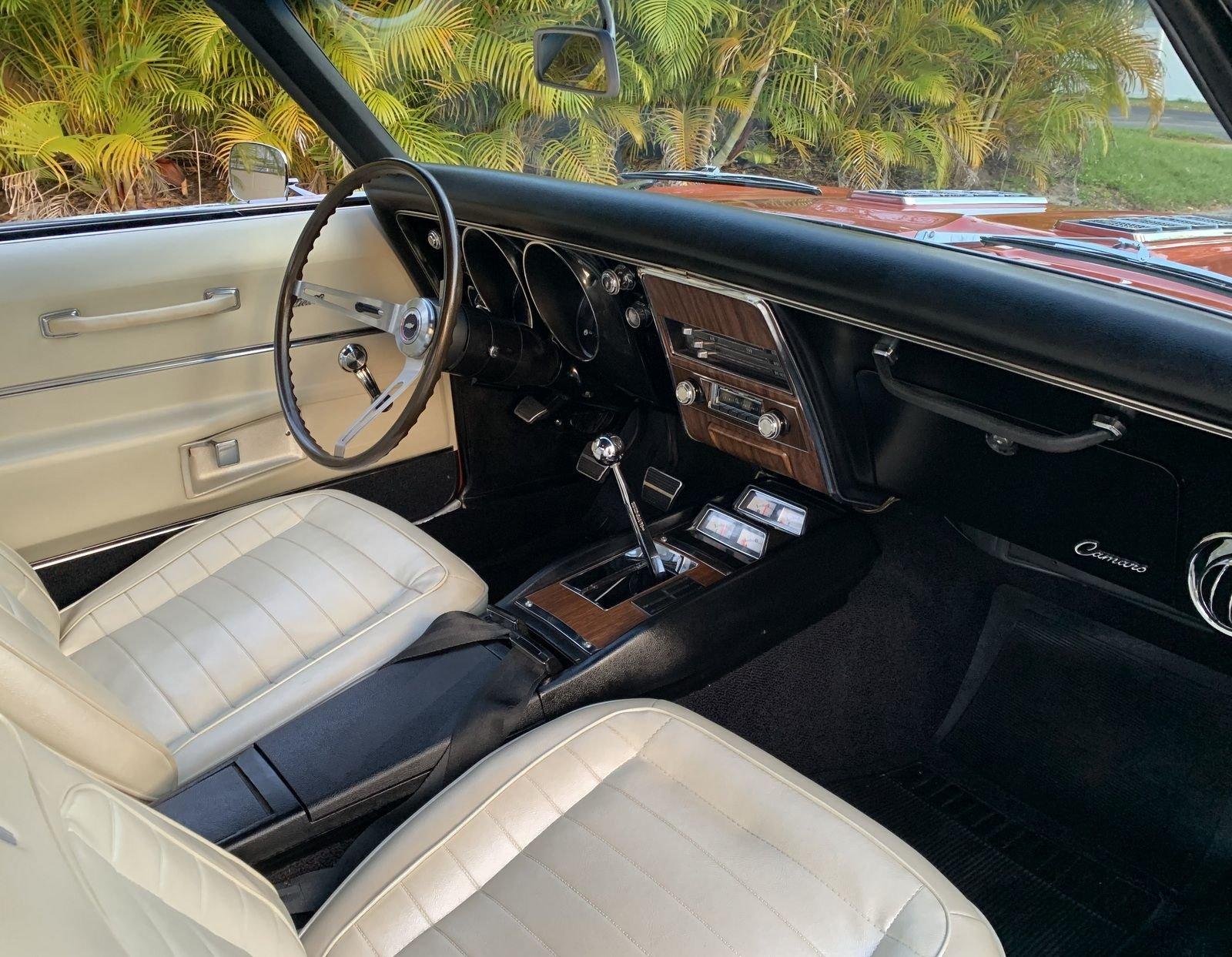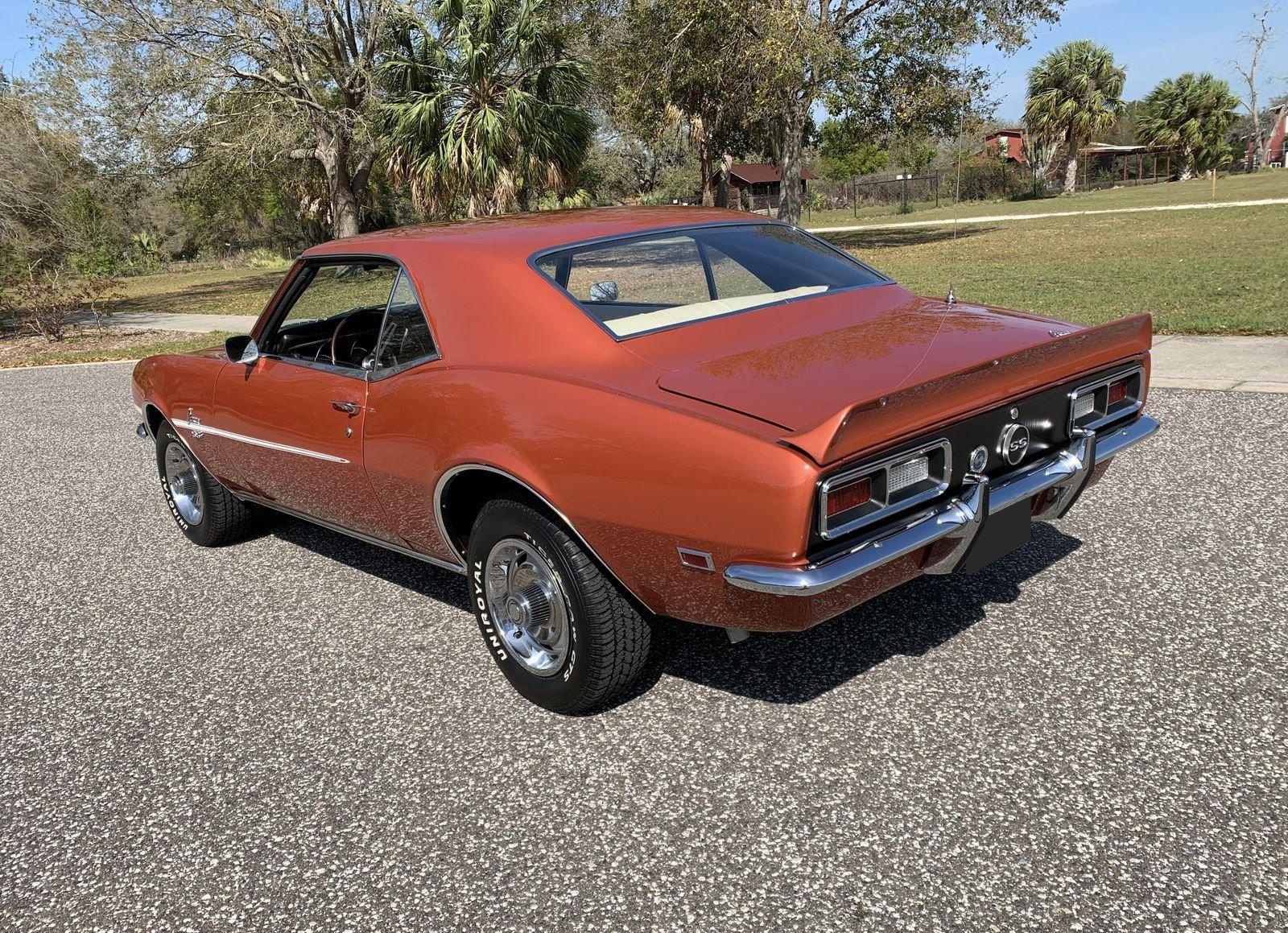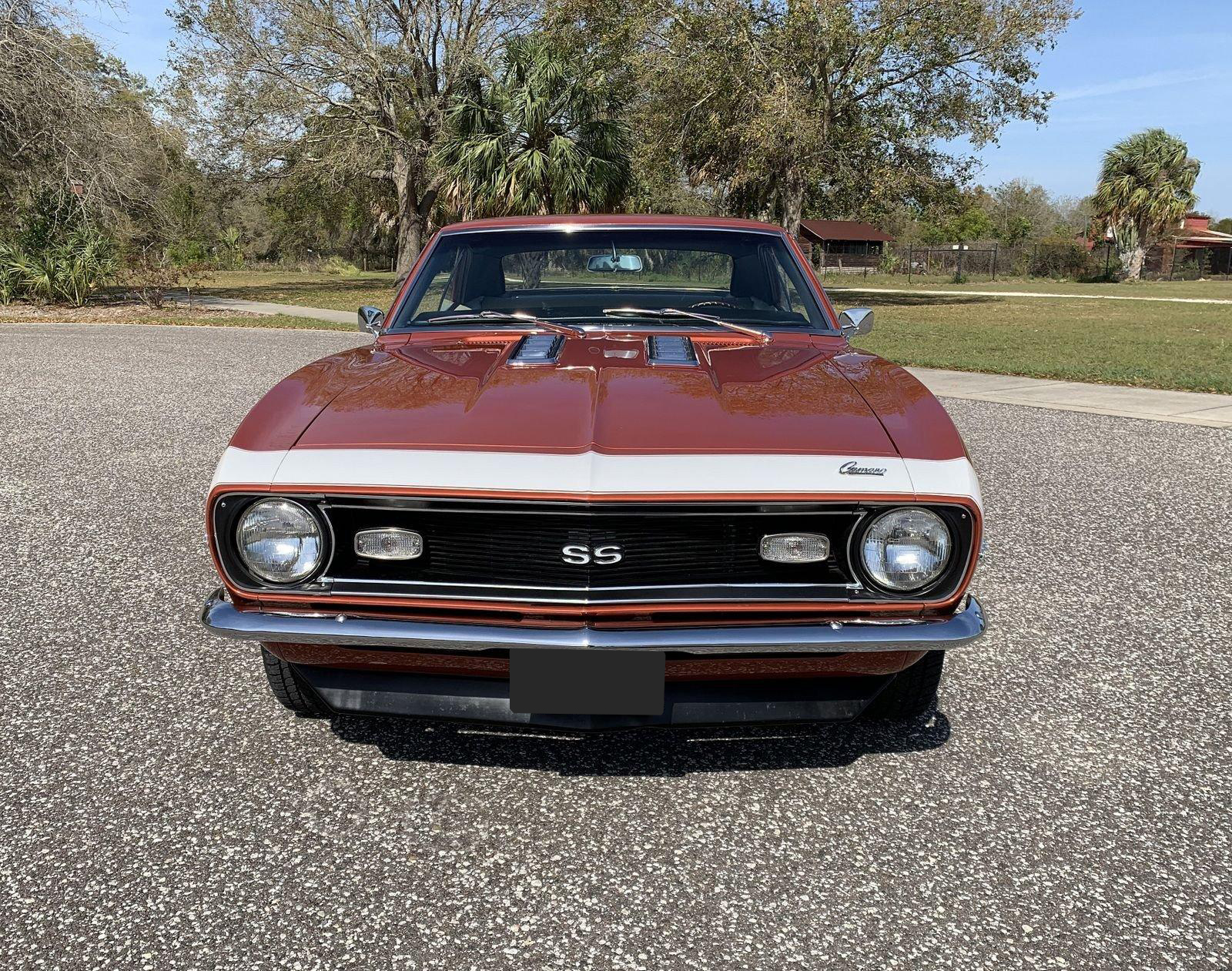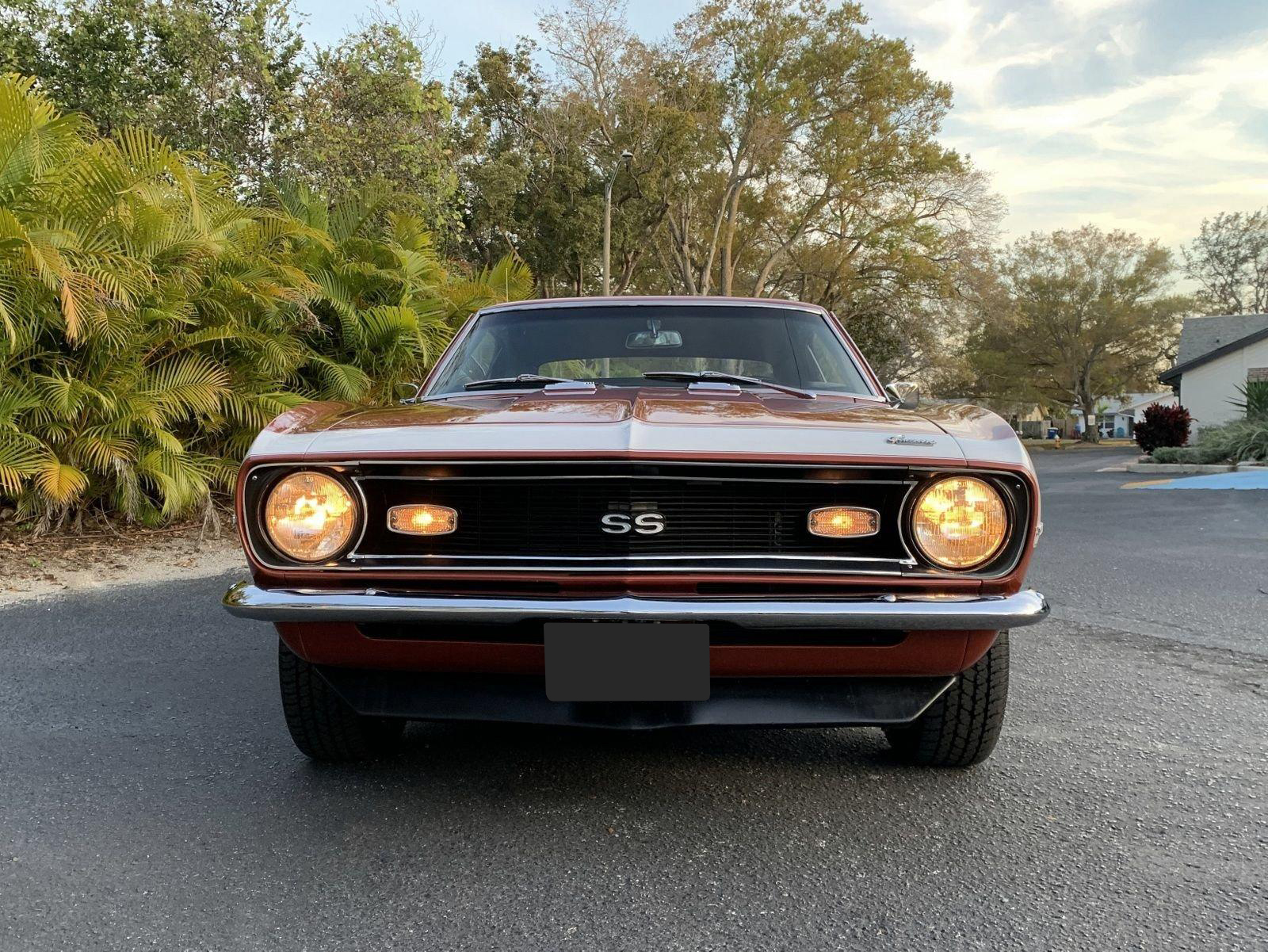 We are pleased to offer this 1968 Chevrolet Camaro SS 350 finished in rare Code 00 Corvette Bronze with white stripes. Powered by its numbers-matching L48 350 V8 factory-rated at 295 hp with a Quadrajet carburetor, snorkel air cleaner, dual exhaust, and upgraded aluminum radiator, it’s paired with a numbers-matching Muncie 4-speed manual transmission and 12-bolt posi rear with 3.31 gears. This Camaro features power steering, Wilwood front disc brakes, and 14” Rally wheels with white letter tires. The interior is equipped with Deluxe Ivory bucket seats, tachometer dash, center console with gauges, and a RetroSound AM/FM radio. With a detailed engine bay and underside, scooped hood, rear spoiler, and sport mirrors, this SS 350 is a standout example ready to show or drive.