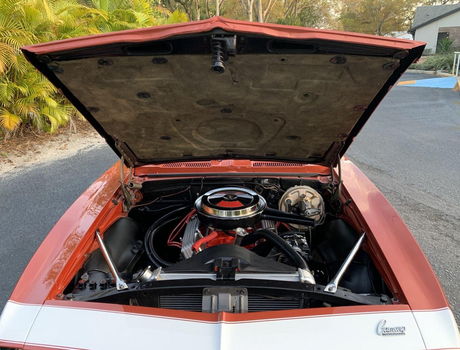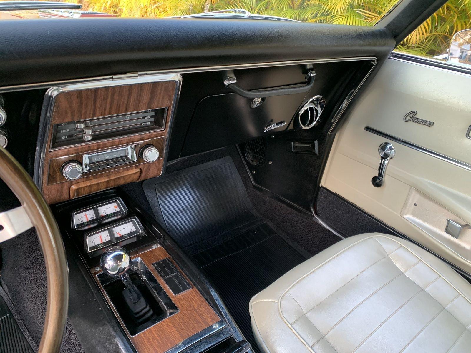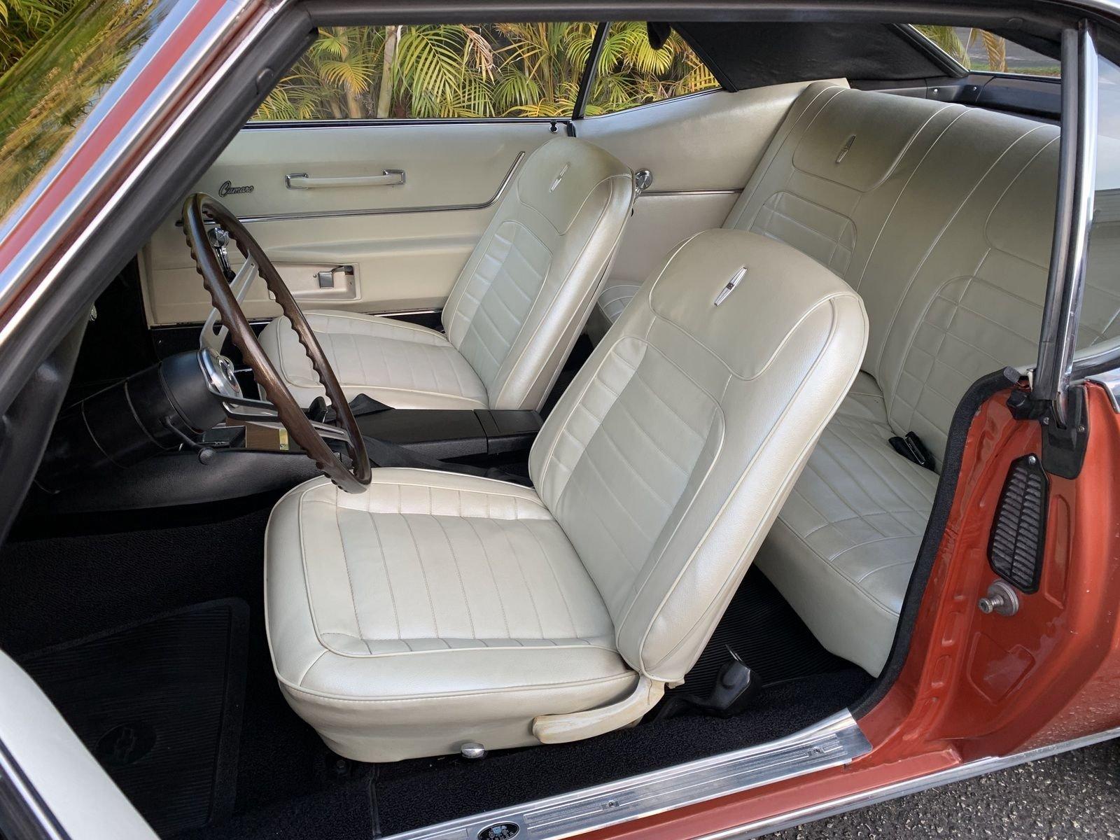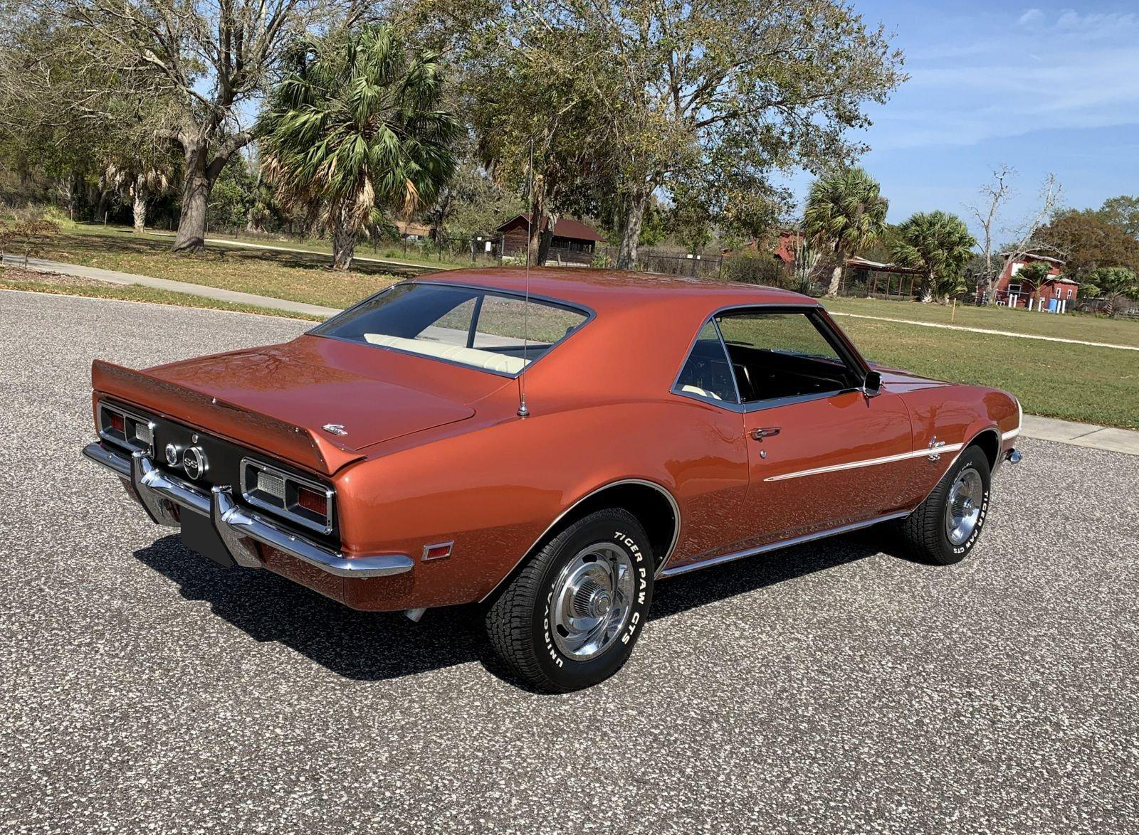 We are pleased to offer this 1968 Chevrolet Camaro SS 350 finished in rare Code 00 Corvette Bronze with white stripes. Powered by its numbers-matching L48 350 V8 factory-rated at 295 hp with a Quadrajet carburetor, snorkel air cleaner, dual exhaust, and upgraded aluminum radiator, it’s paired with a numbers-matching Muncie 4-speed manual transmission and 12-bolt posi rear with 3.31 gears. This Camaro features power steering, Wilwood front disc brakes, and 14” Rally wheels with white letter tires. The interior is equipped with Deluxe Ivory bucket seats, tachometer dash, center console with gauges, and a RetroSound AM/FM radio. With a detailed engine bay and underside, scooped hood, rear spoiler, and sport mirrors, this SS 350 is a standout example ready to show or drive.