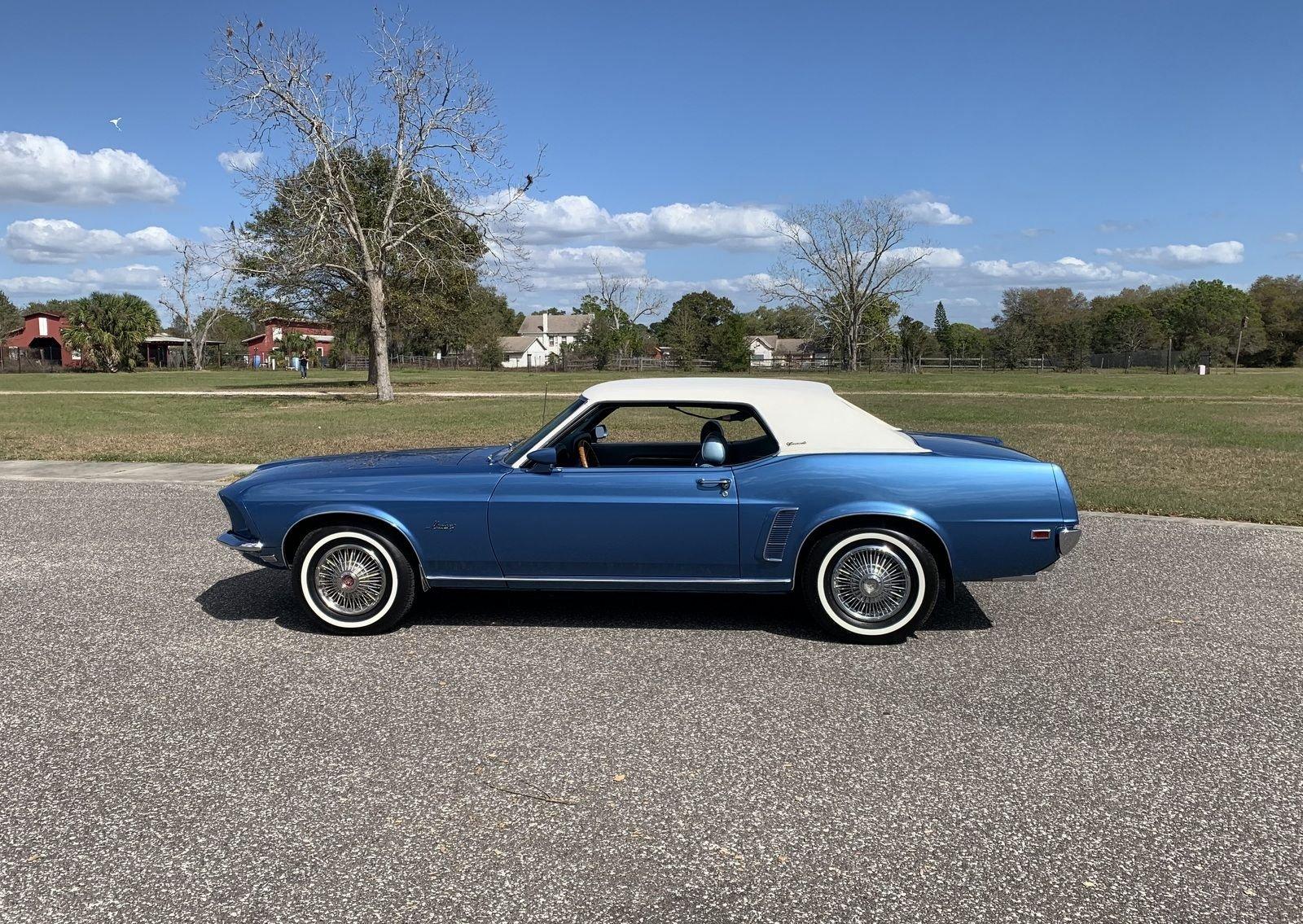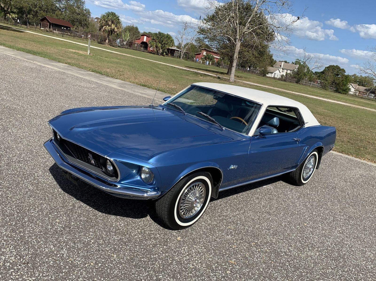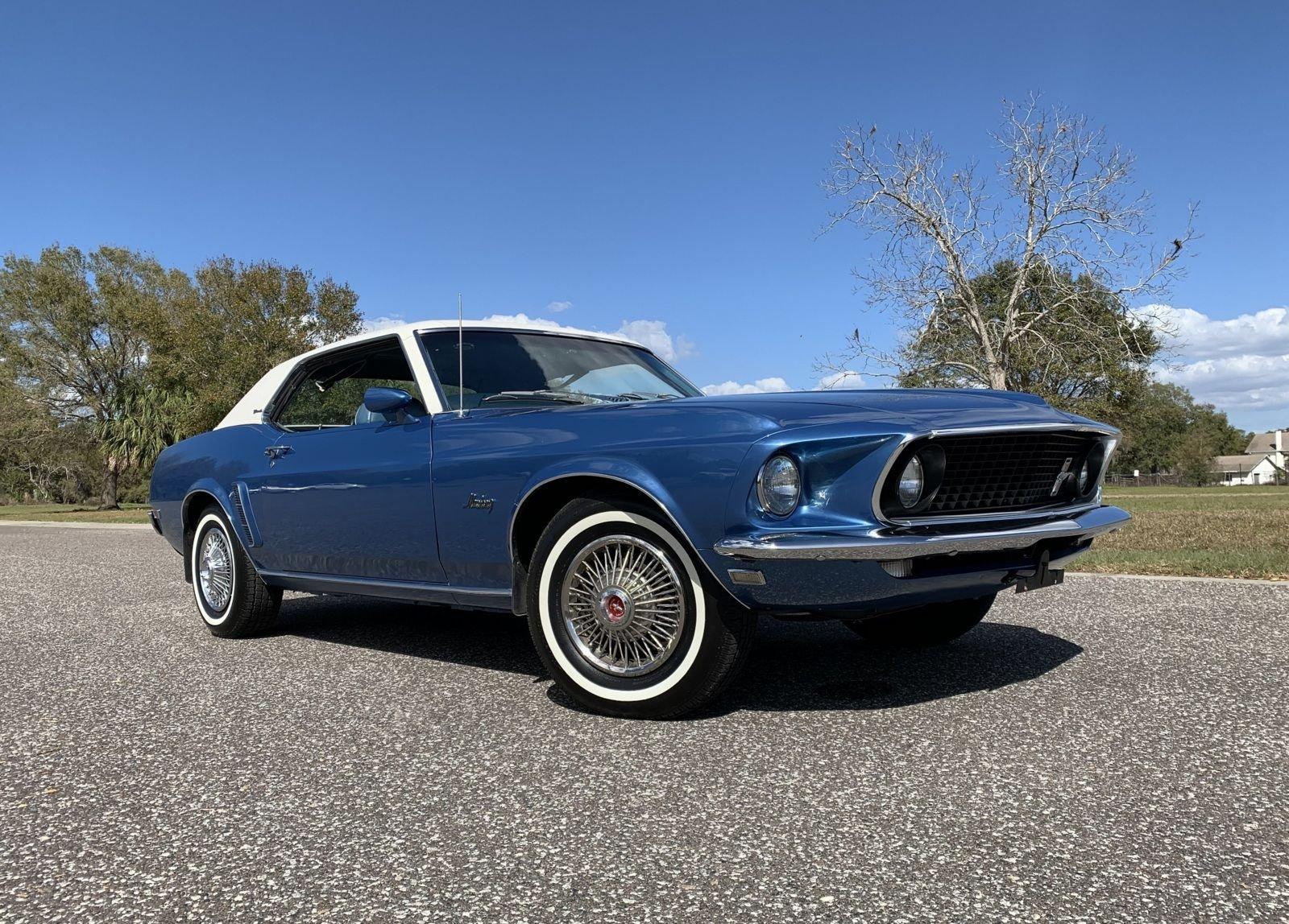 We are pleased to offer this 1969 Ford Mustang Grande for Sale. H Code 351 V8 engine, chrome engine accessories, FMX automatic transmission, 9” rear end, power steering, front power disc brakes, steel wheels with wire caps and radial white wall tires, Acapulco Blue metallic exterior, white vinyl top, factory color keyed sport mirrors, LED tail lights, blue bucket seat interior, center console, floor shifter, cold air conditioning, beautiful dash and gauges, AM/FM radio, DSO Code 72 San Jose, CA car. This Mustang looks and drives great! This Collectible First Year Grande will be an excellent addition to the family!