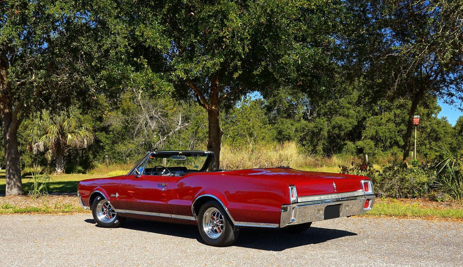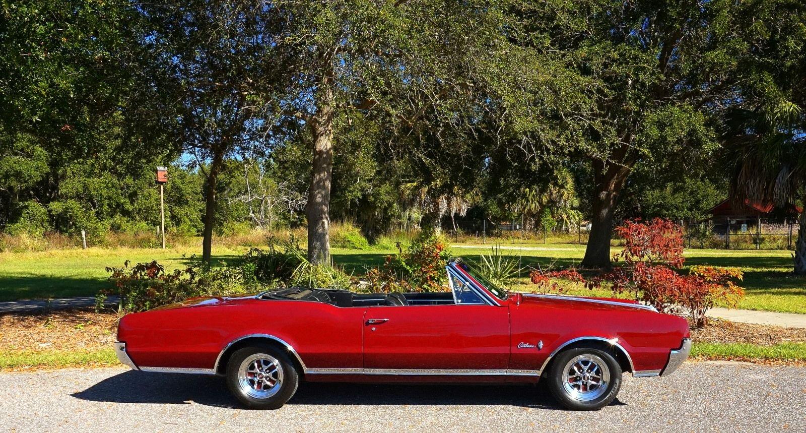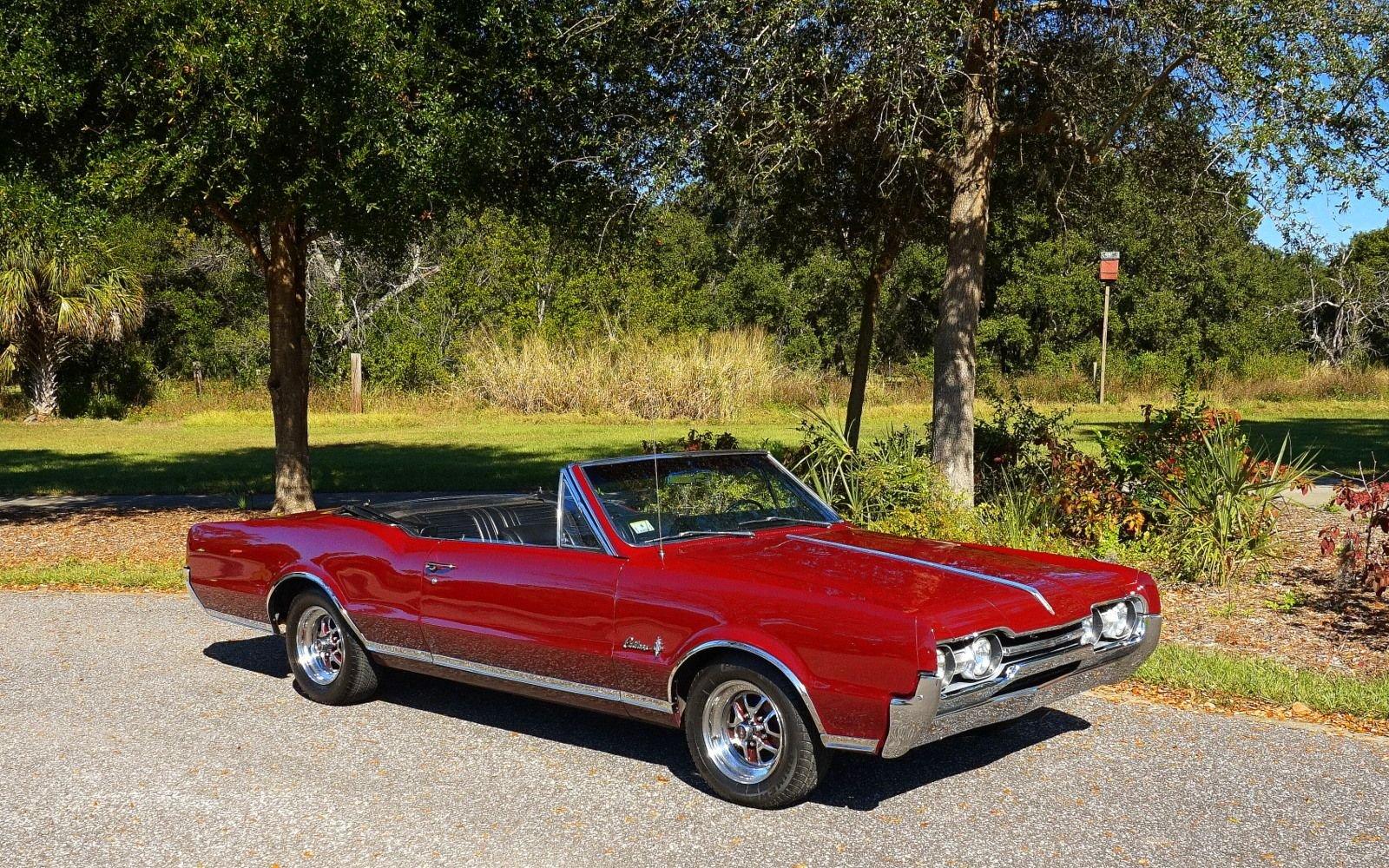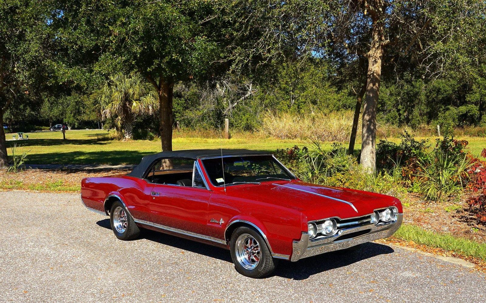 We are pleased to offer this 1967 Oldsmobile Cutlass Convertible for Sale. 330 Cu In V8 engine, automatic transmission, factory air conditioning car, 4 barrel carburetor, dual exhaust, power steering, power brakes, 15” chrome Rally Wheels with radial tires, Code N Burgundy Mist metallic exterior, driver's chrome sport mirror, black power convertible top with boot, black bucket seat interior, power windows, upgraded radio hidden in the glove box.