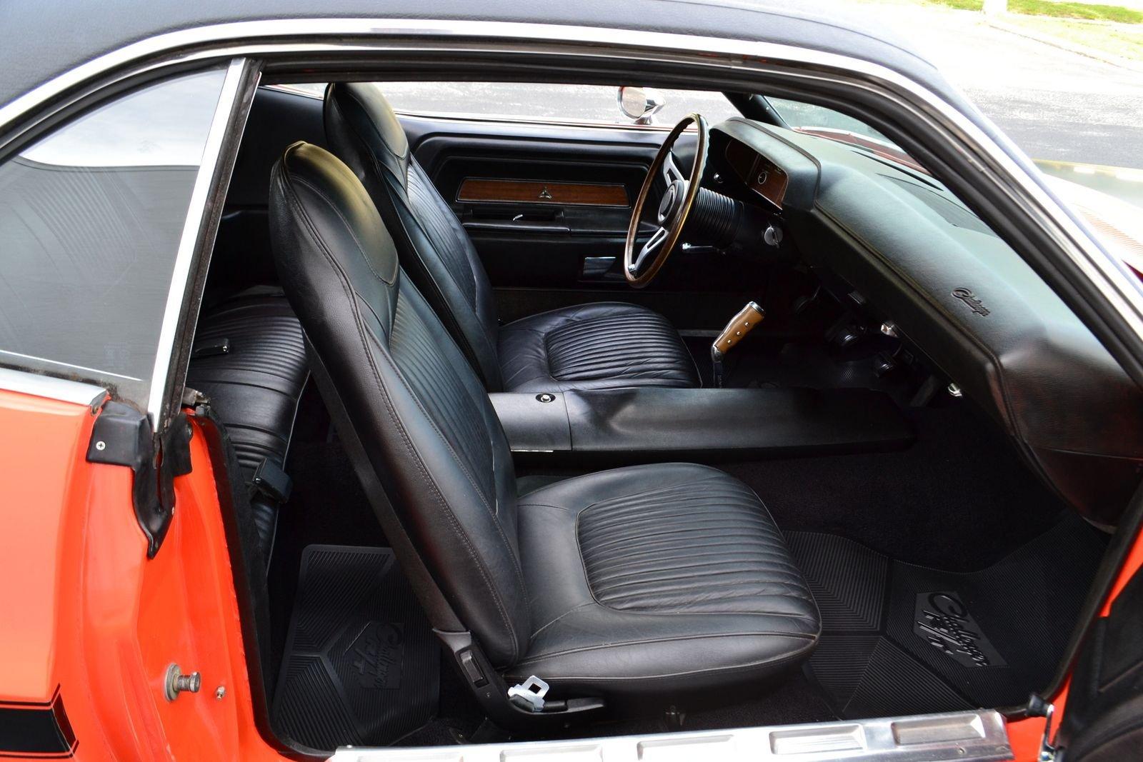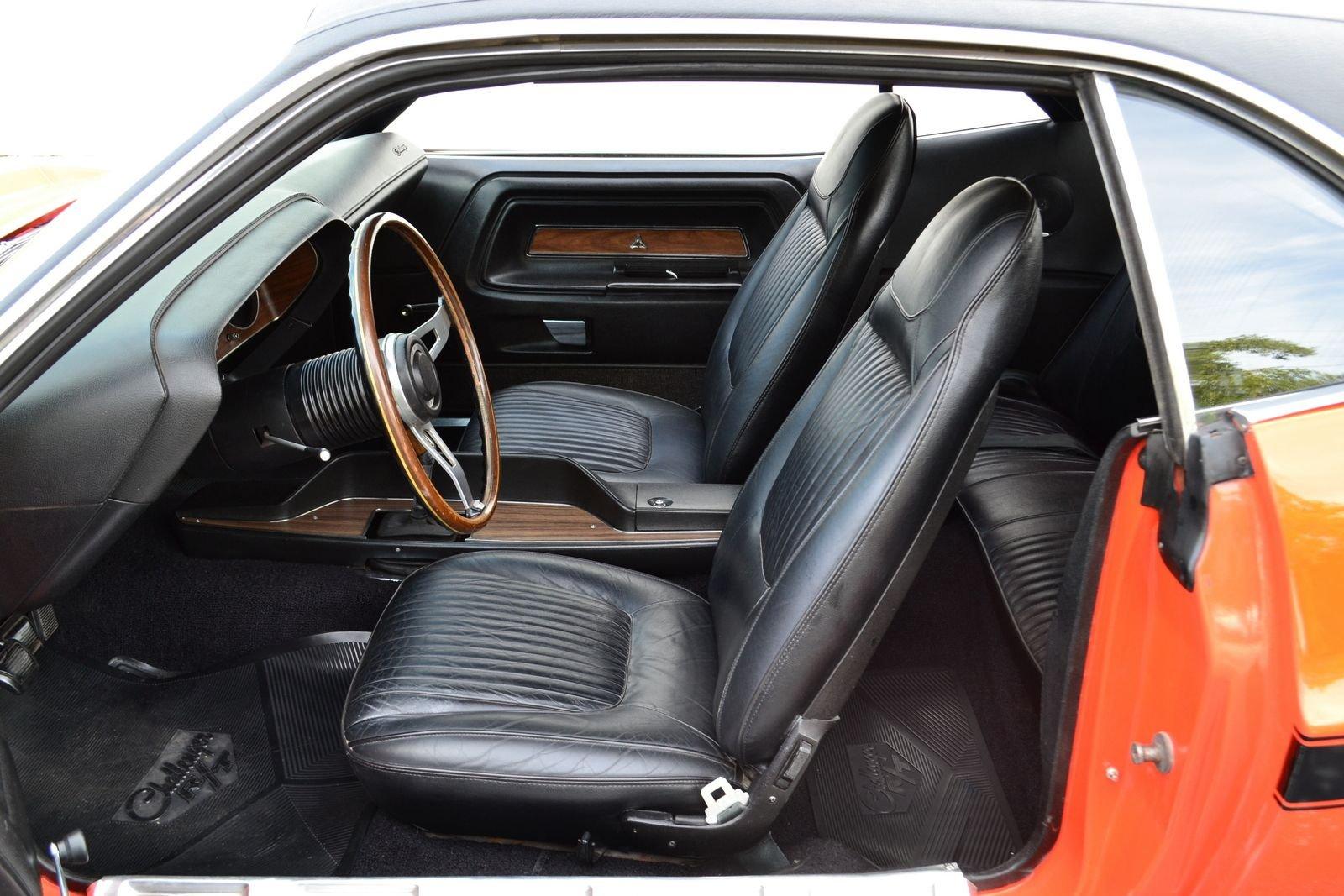70 date coded 440 V8 engine, chrome valves covers, detailed engine bay, aluminum intake with Holley 4 barrel carburetor, dual exhaust with chrome tips, matching VIN number a833 4 speed manual transmission, Super Track Pak Dana 60 rear end, 15” chrome Magnum 500 Wheels with Hoosier white letter radial tires, front power disc brakes, SE vinyl top with small rear window, Hemi Orange exterior with black stripe package, Rallye Hood with scoops, factory equipped hood pins, rear deck spoiler, driver's remote racing mirror, flip top fuel cap, beautiful black leather SE high back bucket seat interior, center console, Hurst Pistol Grip Shifter, overhead consolette, wood grain Rallye Dash. Believed to be 81K original miles. Make this RARE '70 E-Body Super Track Pak 4 Speed Mopar yours today!
